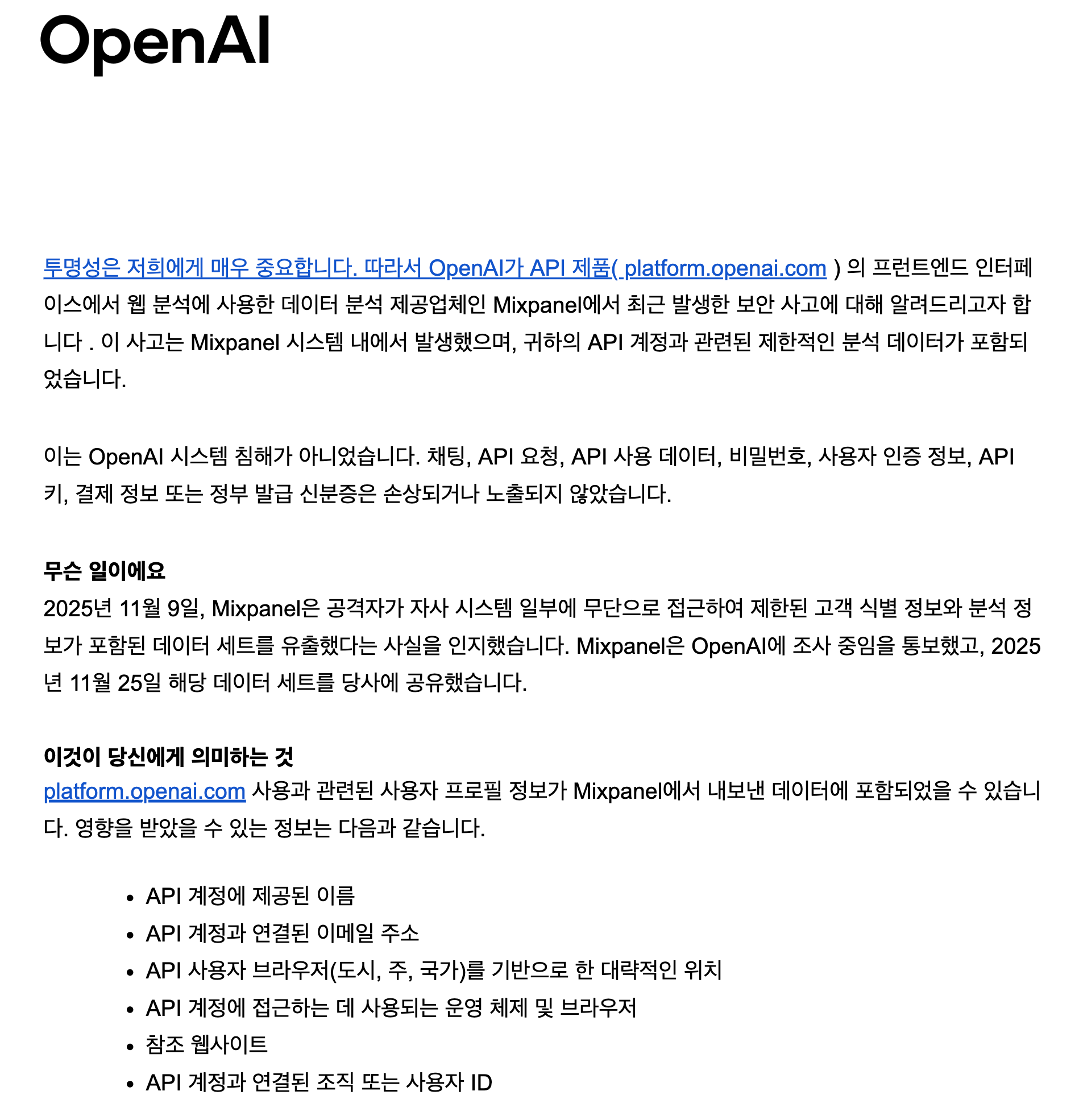 ์ค๋์ OpenAI API ์ฌ์ฉ์ ๋ฐ์ดํฐ ์ ์ถ์ฌ๊ฑด์ ๋ค๋ฃน๋๋ค.