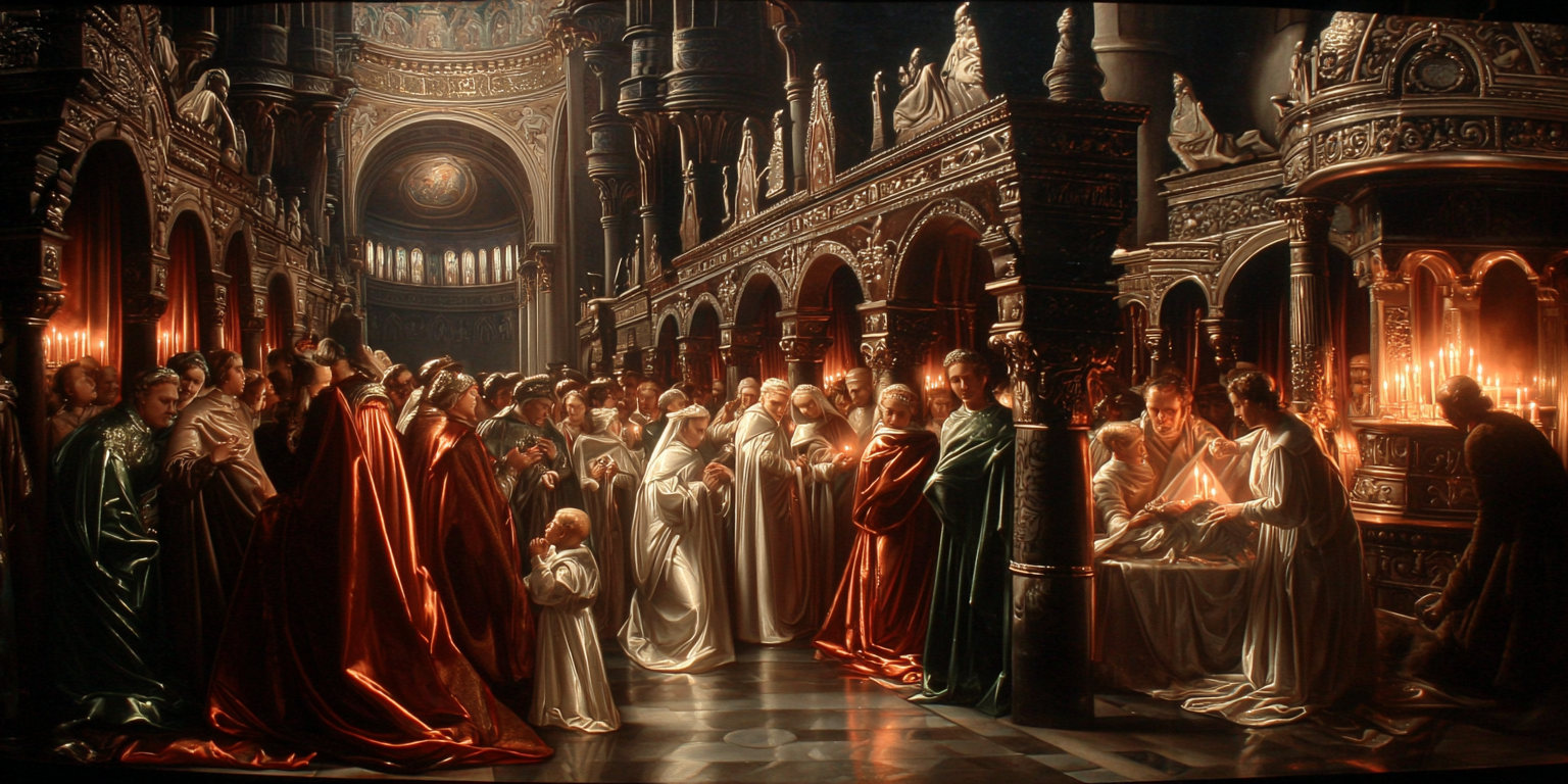cinematic oil painting of a grand Christmas night mass, richly dressed families and children gathered around a glowing nativity scene in a 17th-century European cathedral, towering marble columns and carved angels, swirling red and gold drapery, full and lively human figures in dynamic poses, warm candlelight and soft torch glow against deep shadow, dramatic chiaroscuro, luminous skin tones and shimmering fabrics, clouds of incense rising toward a distant star in a stained-glass window, highly detailed brushwork, majestic yet intimate atmosphere, baroque altar painting style --chaos 5 --ar 2:1 --raw --sref 7603001311 --stylize 150