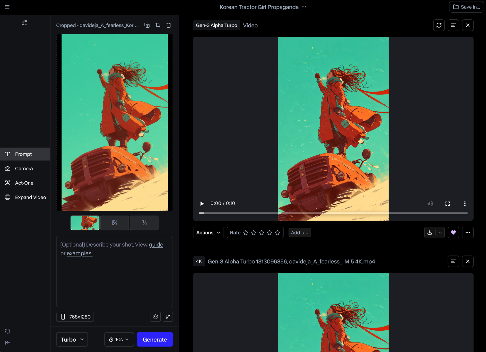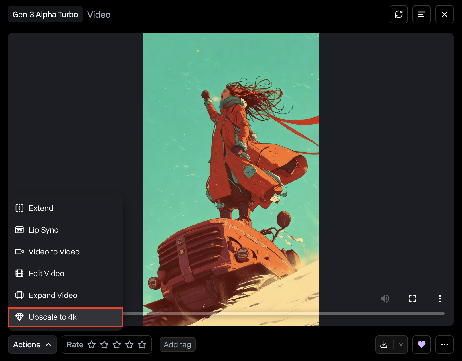 ์์์ด ์์ฑ๋ ๋ค 'Actions' ๋ฒํผ์ ํด๋ฆญํ์ฌ 'Upscale to 4k'๋ฅผ ์ ํํฉ๋๋ค.