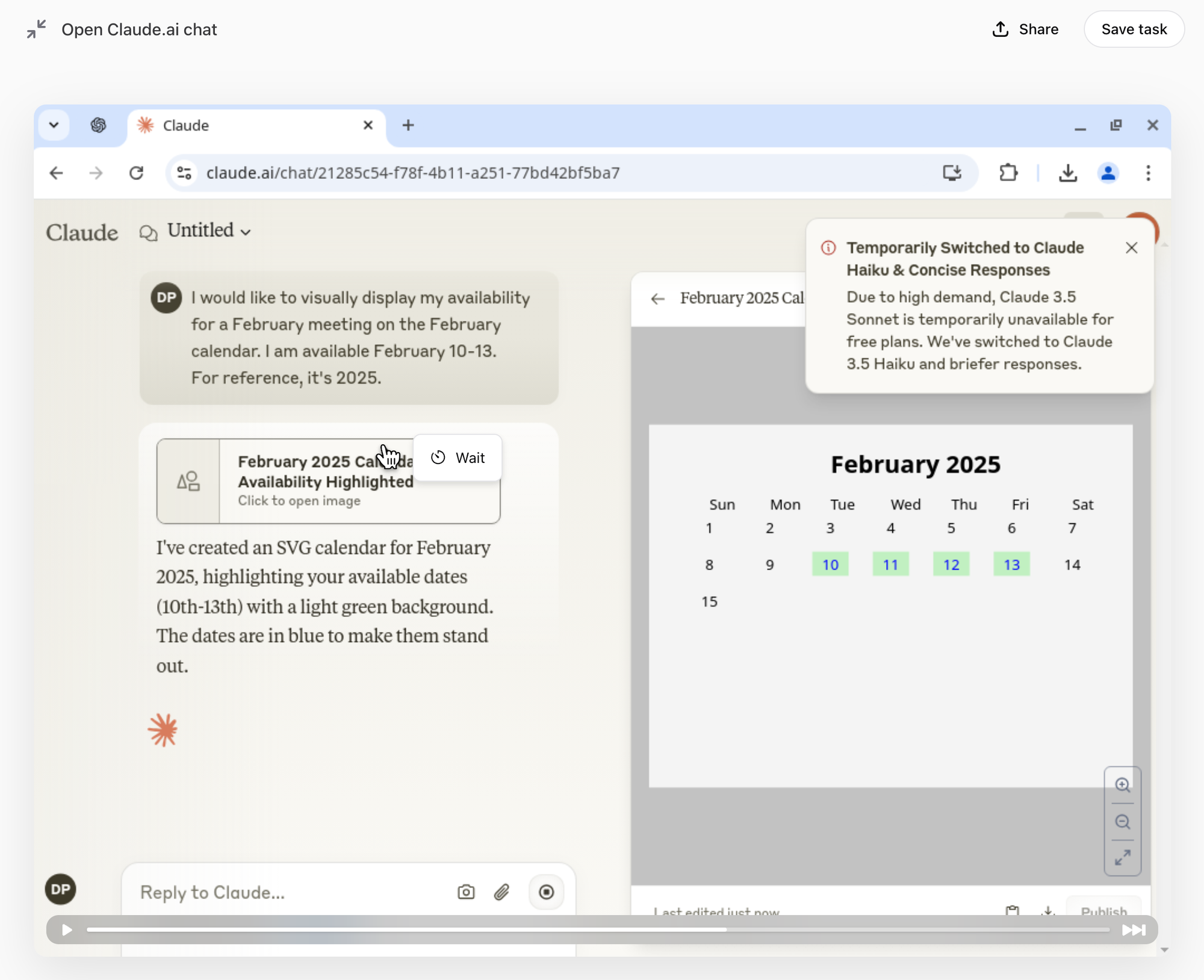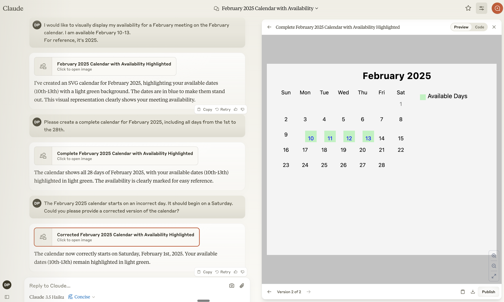 ํ๋กฌํํธ 2-2: write this prompt: I would like to visually display my availability for a February meeting on the February calendar. I am available February 10-13. For reference, it's 2025. (์ด๋ ๊ฒ ํ๋กฌํํธ ์ ์ด์ค: 2์ ๋ฌ๋ ฅ์ 2์ ๋ฏธํ ์ ์ฐธ์ ๊ฐ๋ฅํ ์๊ฐ์ ์๊ฐ์ ์ผ๋ก ํ์ํ๊ณ ์ถ์ต๋๋ค. 2์ 10์ผ๋ถํฐ 13์ผ๊น์ง ๊ฐ๋ฅํฉ๋๋ค. ์ฐธ๊ณ ๋ก ์ง๊ธ์ 2025๋ ์ ๋๋ค.)