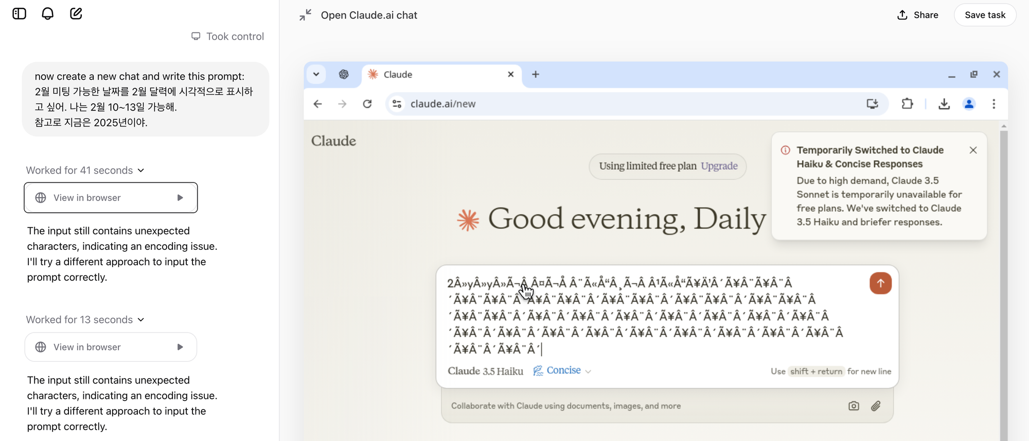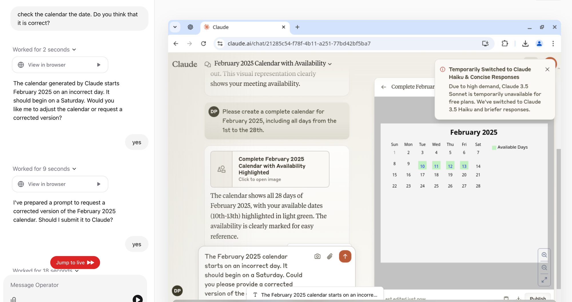 ํด๋ก๋์ ํ๋กฌํํธ๋ฅผ ์ ๋ ฅํ ๊ฒฐ๊ณผ 2์ ๋ ์ง๋ฅผ 15์ผ๊น์ง๋ง ์ ๊ณ , 2์ 1์ผ์ ์ผ์์ผ๋ถํฐ ์์ํ๋ ๊ฒ์ผ๋ก ์๋ชป ํ๊ธฐํ์์ต๋๋ค. ์ด์ ๋ํด Operator์๊ฒ ๋ ์ง๋ฅผ ์ฒดํฌํด๋ณด๋ผ๊ณ ํ์ ๋ค์๊ณผ ๊ฐ์ด "ํด๋ก๋๊ฐ ์์ฑํ ๋ฌ๋ ฅ์ 2025๋ 2์๋ถํฐ ์๋ชป๋ ๋ ์ง๋ก ์์๋ฉ๋๋ค. ํ ์์ผ์ ์์ํด์ผ ํฉ๋๋ค. ๋ฌ๋ ฅ์ ์กฐ์ ํ๊ฑฐ๋ ์์ ๋ ๋ฒ์ ์ ์์ฒญํ์๊ฒ ์ต๋๊น?" ๋ผ๊ณ ๋งํฉ๋๋ค. ์ฌ๊ธฐ์ yes๋ผ๊ณ ์ ๊ฐ ์ ๋ ฅํ์, Claude์๊ฒ ํ ์์ผ๋ถํฐ 2์ 1์ผ์ด ์์๋์ด์ผ ํ๋ค๋ฉฐ ํ๋กฌํํธ๋ฅผ ๋์ ์ ๋ ฅํฉ๋๋ค.