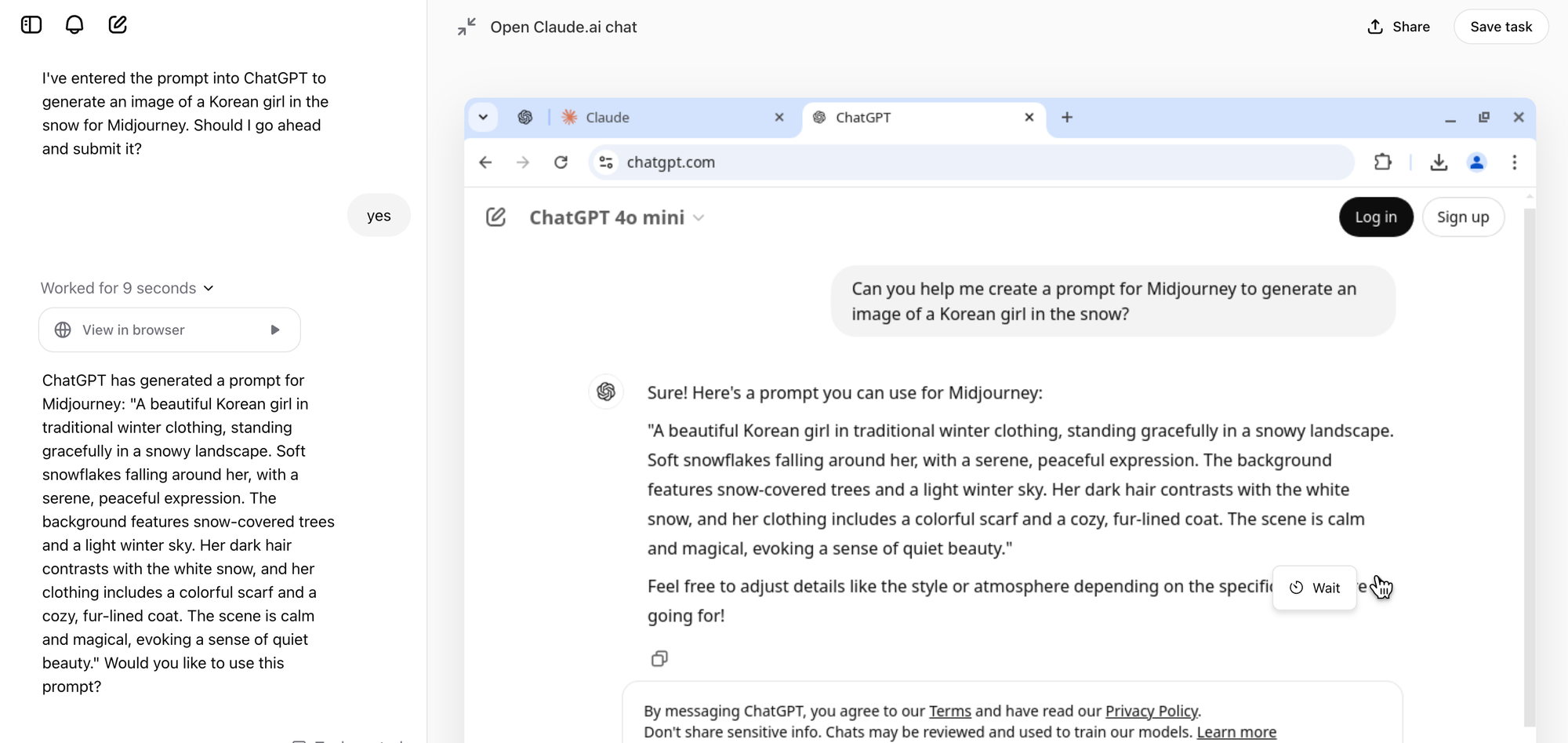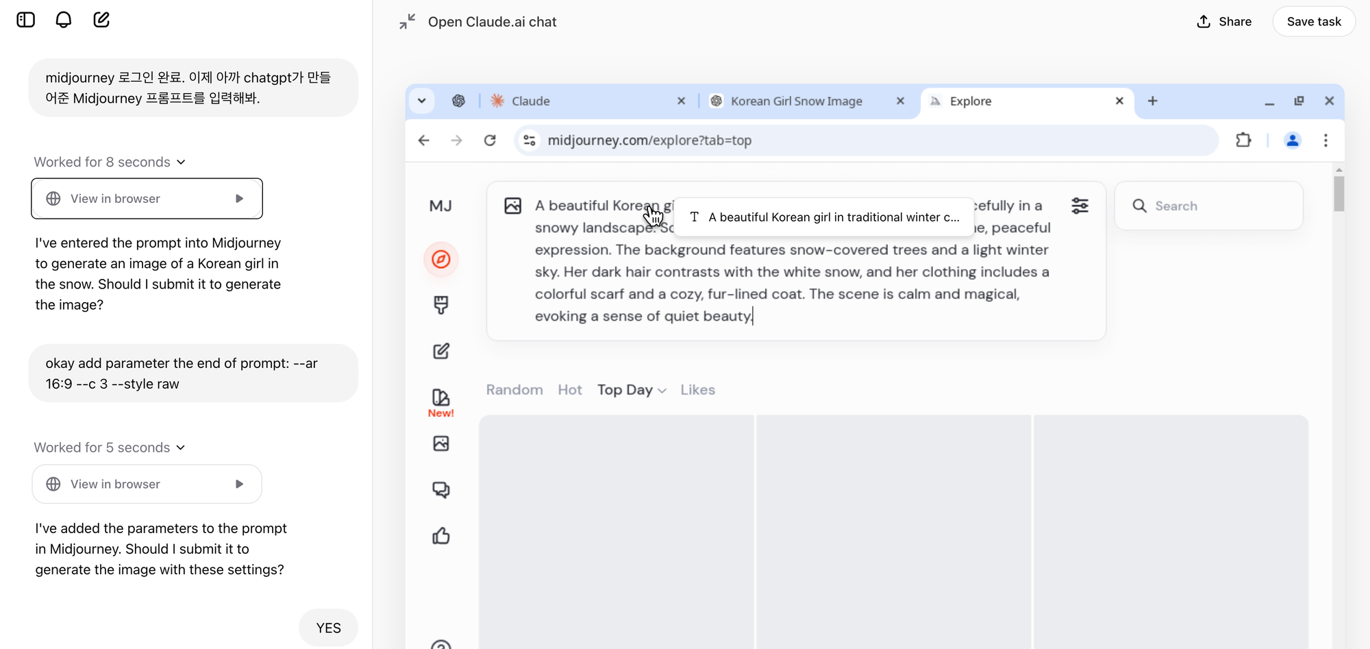 Operator๋ฅผ ์ฌ์ฉํด ChatGPT๋ก ์ด๋ฏธ์ง ์์ฑ ํ๋กฌํํธ๋ฅผ ์์ฑํ๊ณ , Midjourney์ ์ ๋ ฅ ํ ์์ฑํ๋ ์คํ๋ ์งํํด๋ณด์์ต๋๋ค.