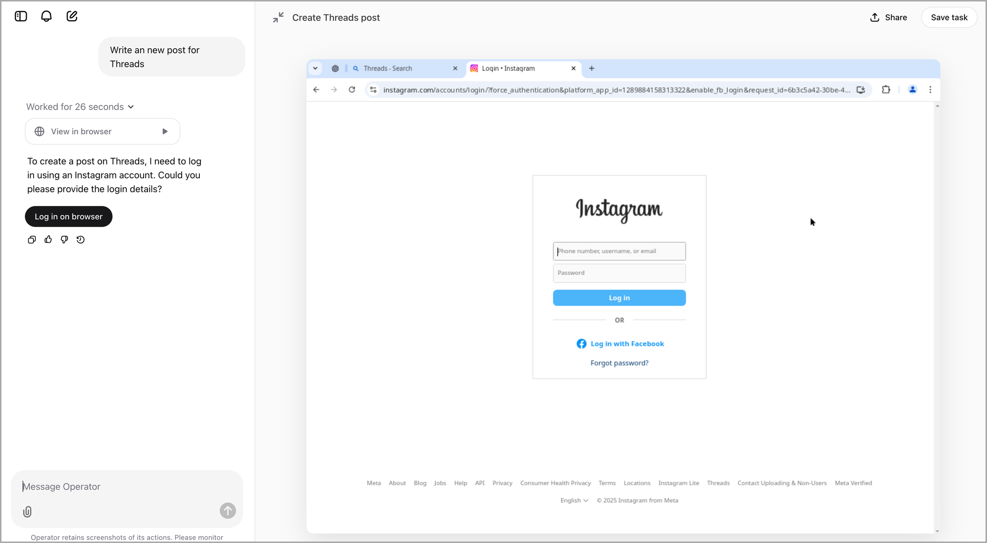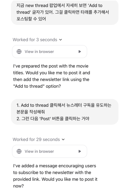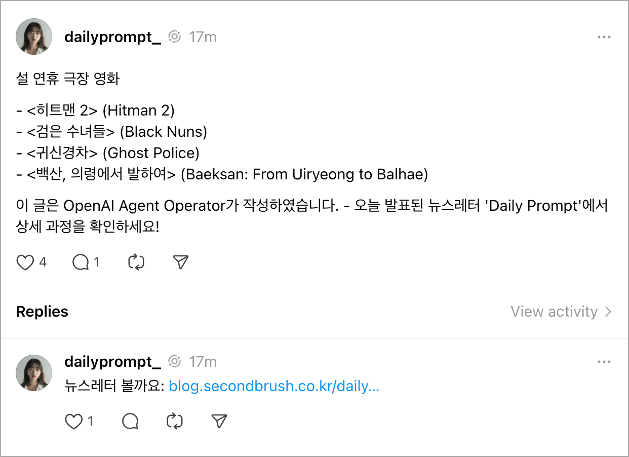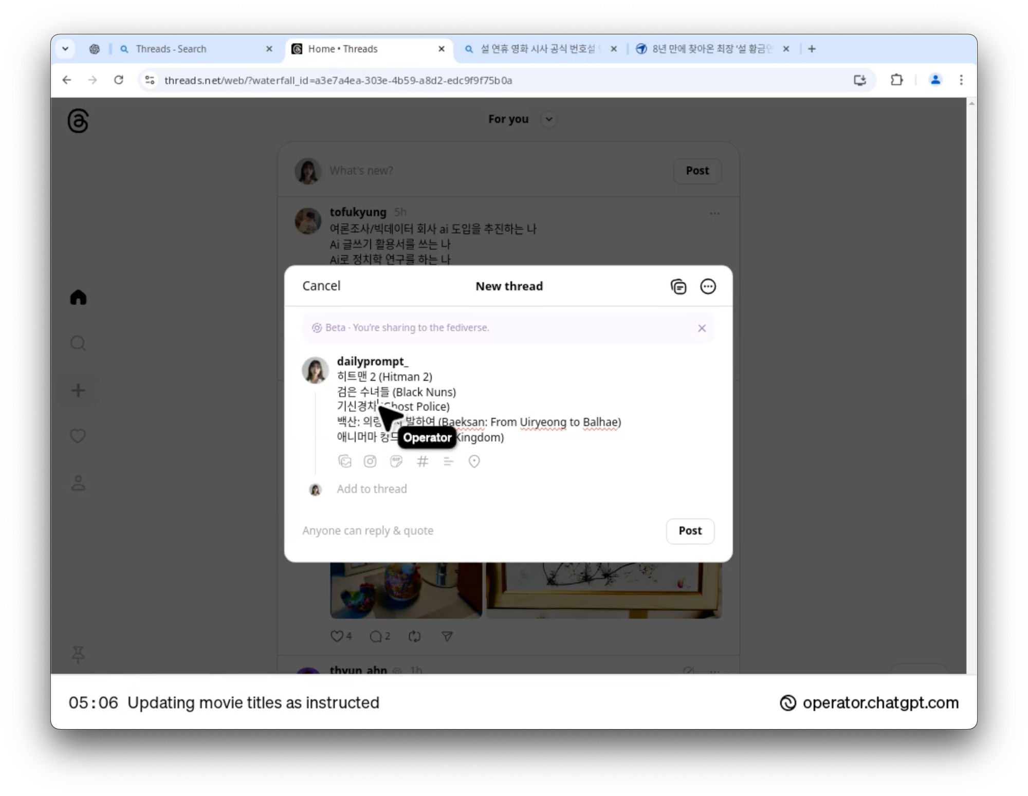 ์ง๋ 432ํ์์ OpenAI์ Agent, Operator๋ฅผ ์๊ฐ๋๋ ธ๋๋ฐ์, ์ค๋์ Operator์๊ฒ SNS ๊ธ ์์ฑ ๋ฐ ์ ๋ก๋๋ฅผ ์์ผ๋ณด์์ต๋๋ค. ์ฌ์ฉํ SNS๋ ์น ๊ธฐ๋ฐ์ผ๋ก ํฌ์คํ ์ด ๊ฐ๋ฅํ '์ฐ๋ ๋(Threads)'์ ๋๋ค.