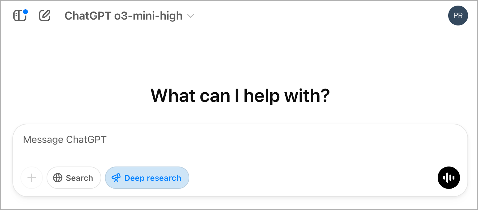 ์๋์ ๊ฐ์ด 'Deep Research' ๋ฒํผ์ ํด๋ฆญํ์ฌ ํ์ฑํ์ํต๋๋ค. ์ ๋ o3-mini-high ๋ชจ๋ธ์ ์ฌ์ฉํ์ต๋๋ค.