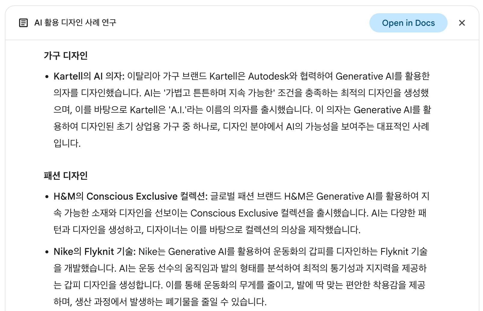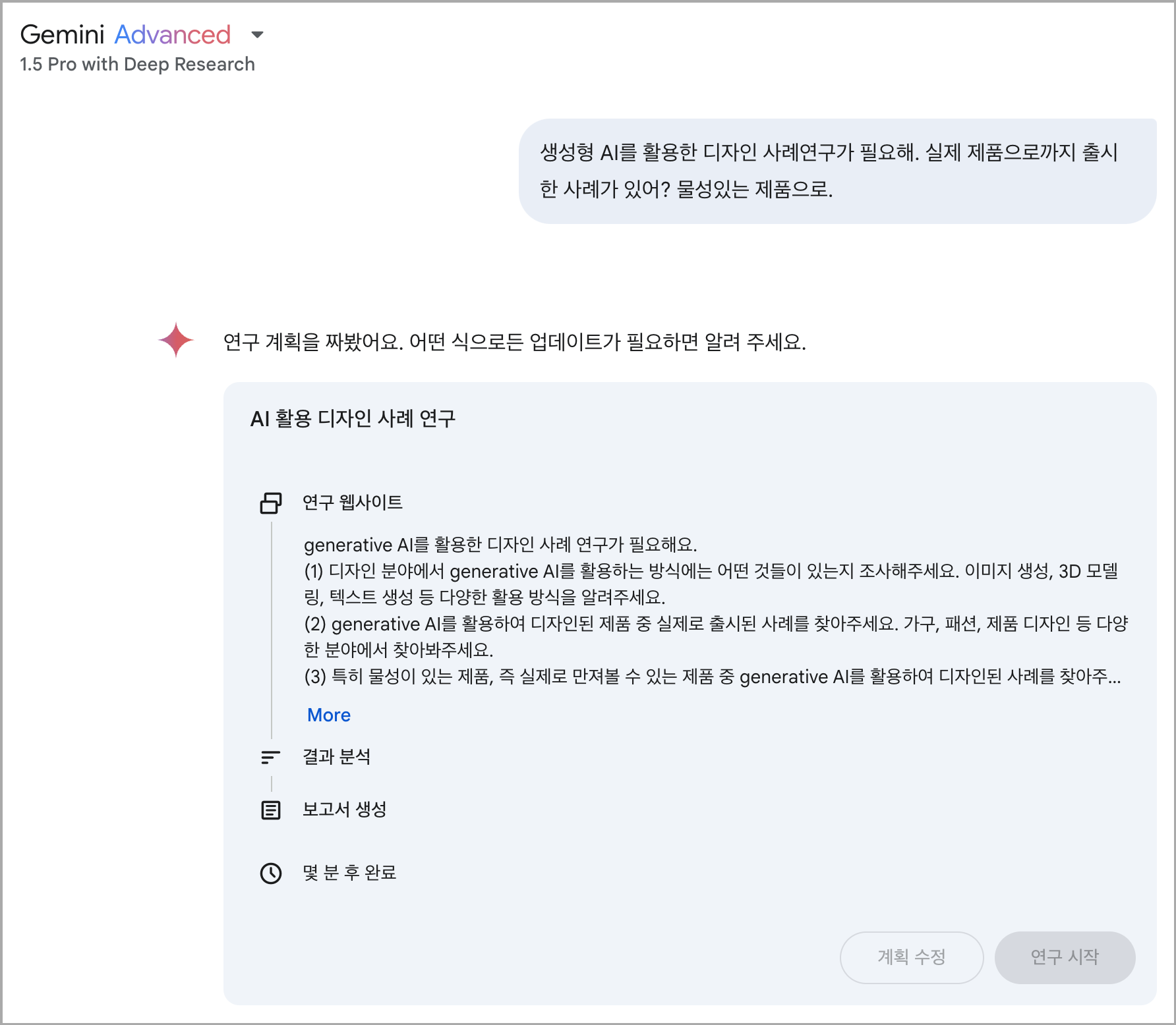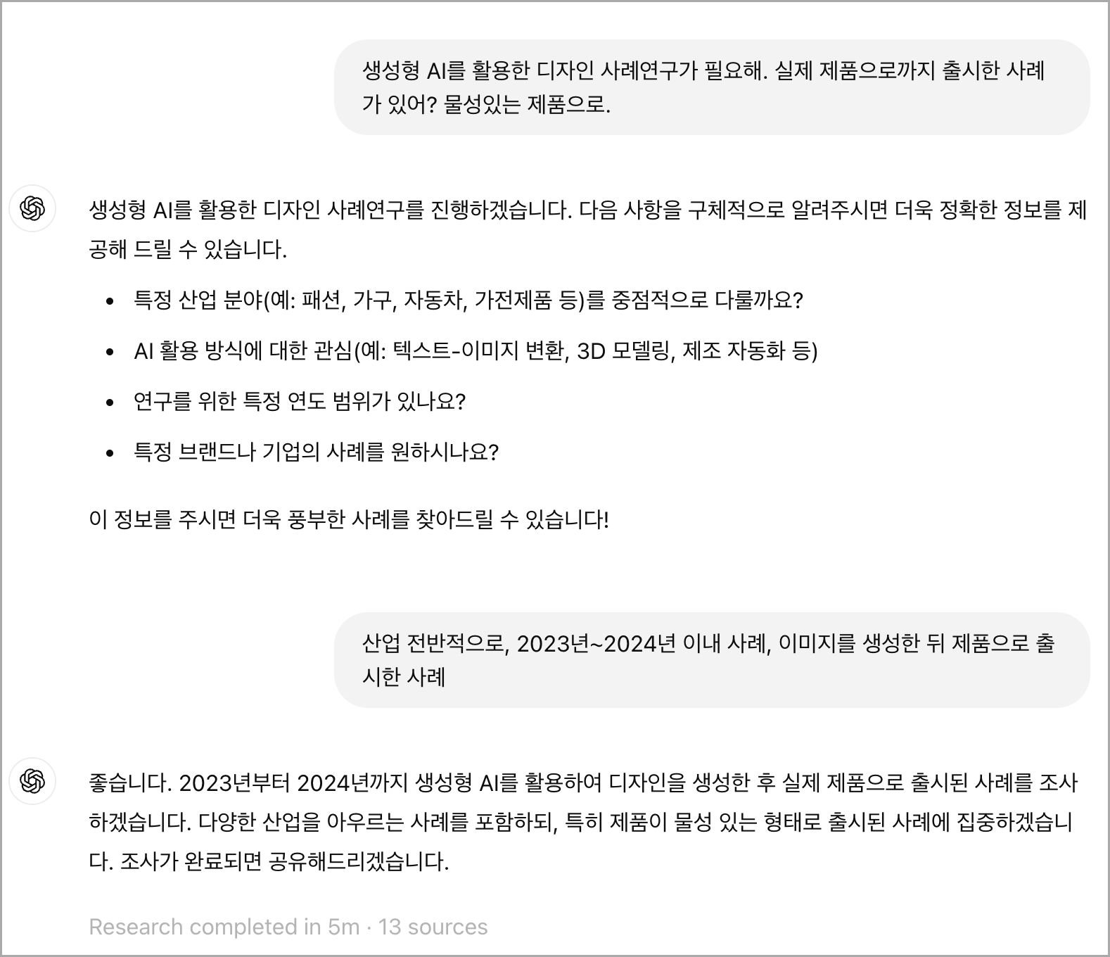 ์ค๋์ ํ๋กฌํํธ: ์์ฑํ AI๋ฅผ ํ์ฉํ ๋์์ธ ์ฌ๋ก์ฐ๊ตฌ๊ฐ ํ์ํด. ์ค์ ์ ํ์ผ๋ก๊น์ง ์ถ์ํ ์ฌ๋ก๊ฐ ์์ด? ๋ฌผ์ฑ์๋ ์ ํ์ผ๋ก.