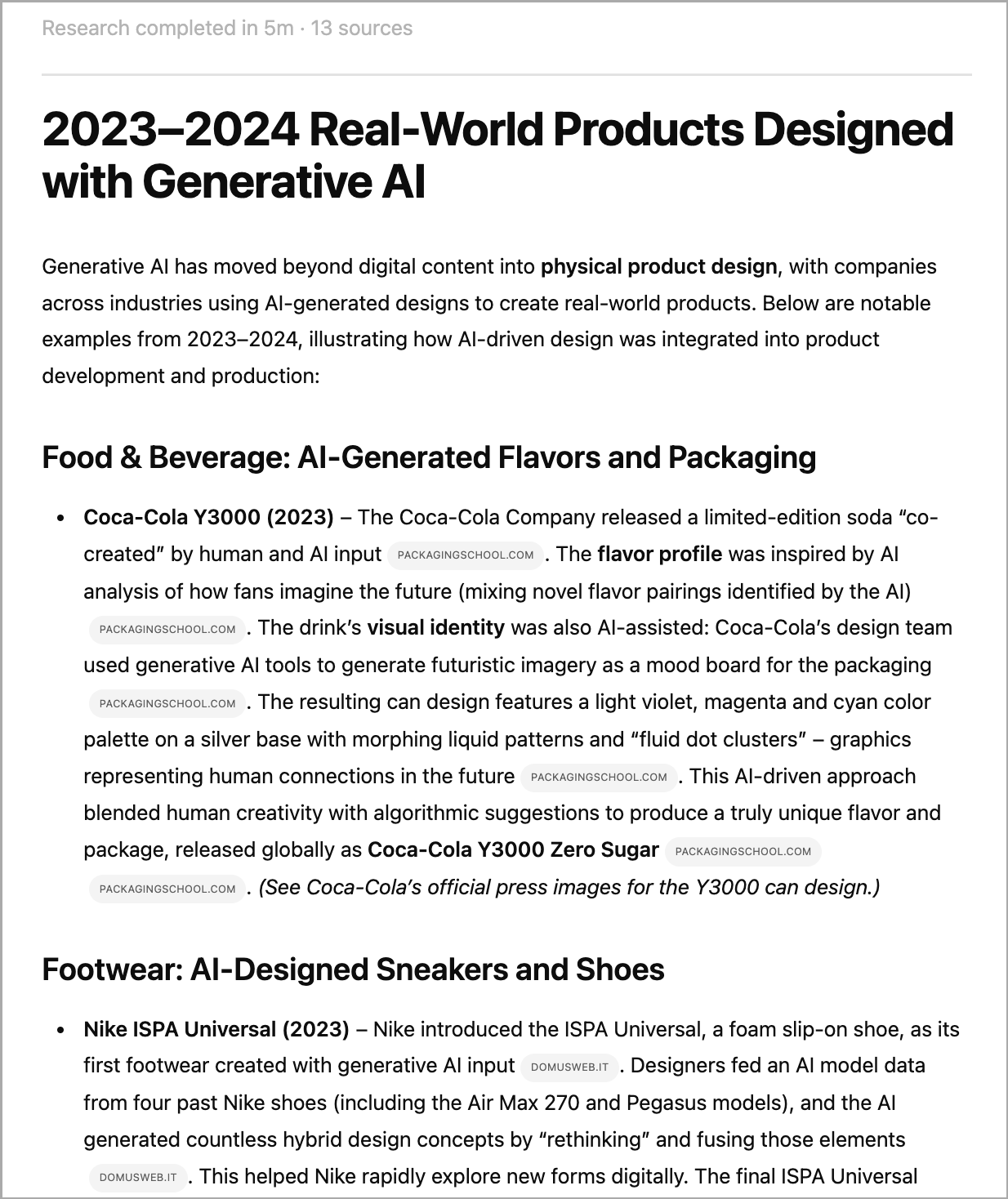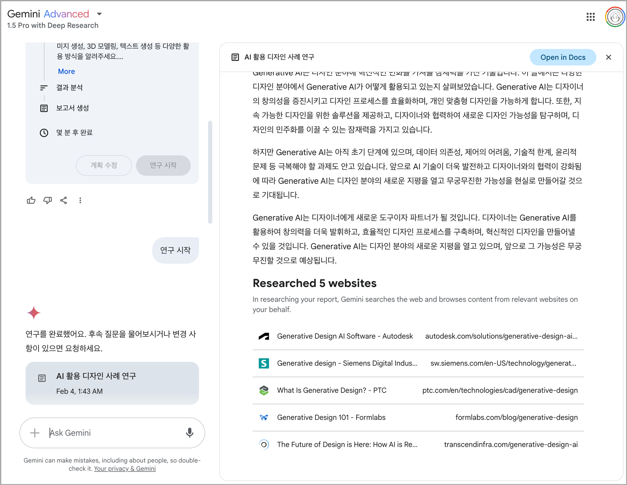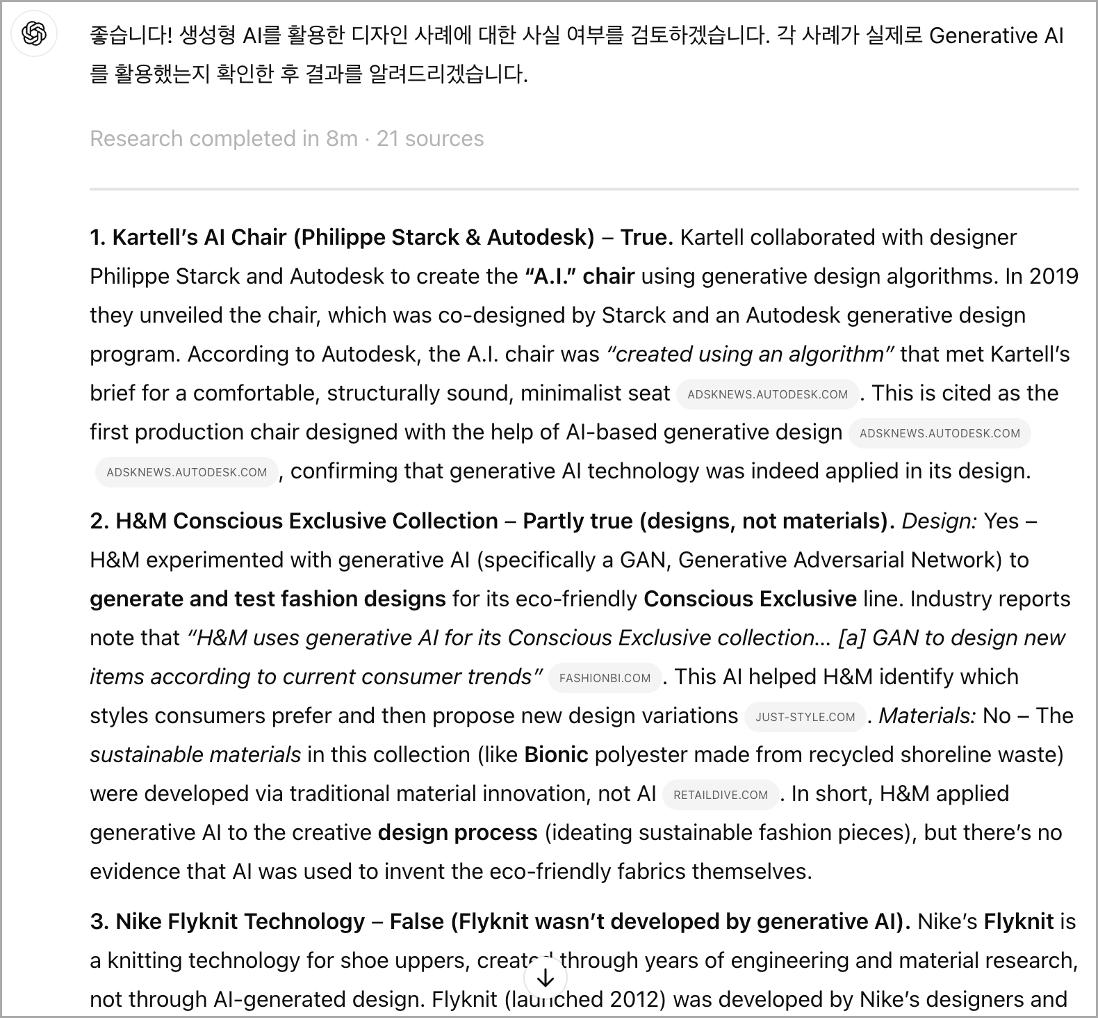 Gemini์ ๊ธด ๋ต๋ณ ์ค ์ฌ๋ก ๋ถ๋ถ๋ง ๋ณต์ฌํ์ฌ ChatGPT์๊ฒ ์ฃผ๊ณ +Deep Research๋ฅผ ์ผ๊ณ , "์์ฑํ AI๋ฅผ ํ์ฉํ ๋์์ธ ์ฌ๋ก๋ก ๋ค์๊ณผ ๊ฐ์ด gemini๋ก๋ถํฐ ๋ต๋ณ์ ๋ฐ์์ด. ํ ๋ฃจ์๋ค์ด์ ์ด ์๋ ๊ฒ ๊ฐ์๋ฐ fact check ํด์ค."๋ผ๊ณ ํ๋กฌํํธ๋ฅผ ์ ๋ ฅํ์ต๋๋ค. ๊ทธ ๊ฒฐ๊ณผ ์๋ ์์๊ณผ ๊ฐ์ด ์กฐ์ฌ๋ฅผ ํ๊ณ ๋ต๋ณ์ ํฉ๋๋ค.