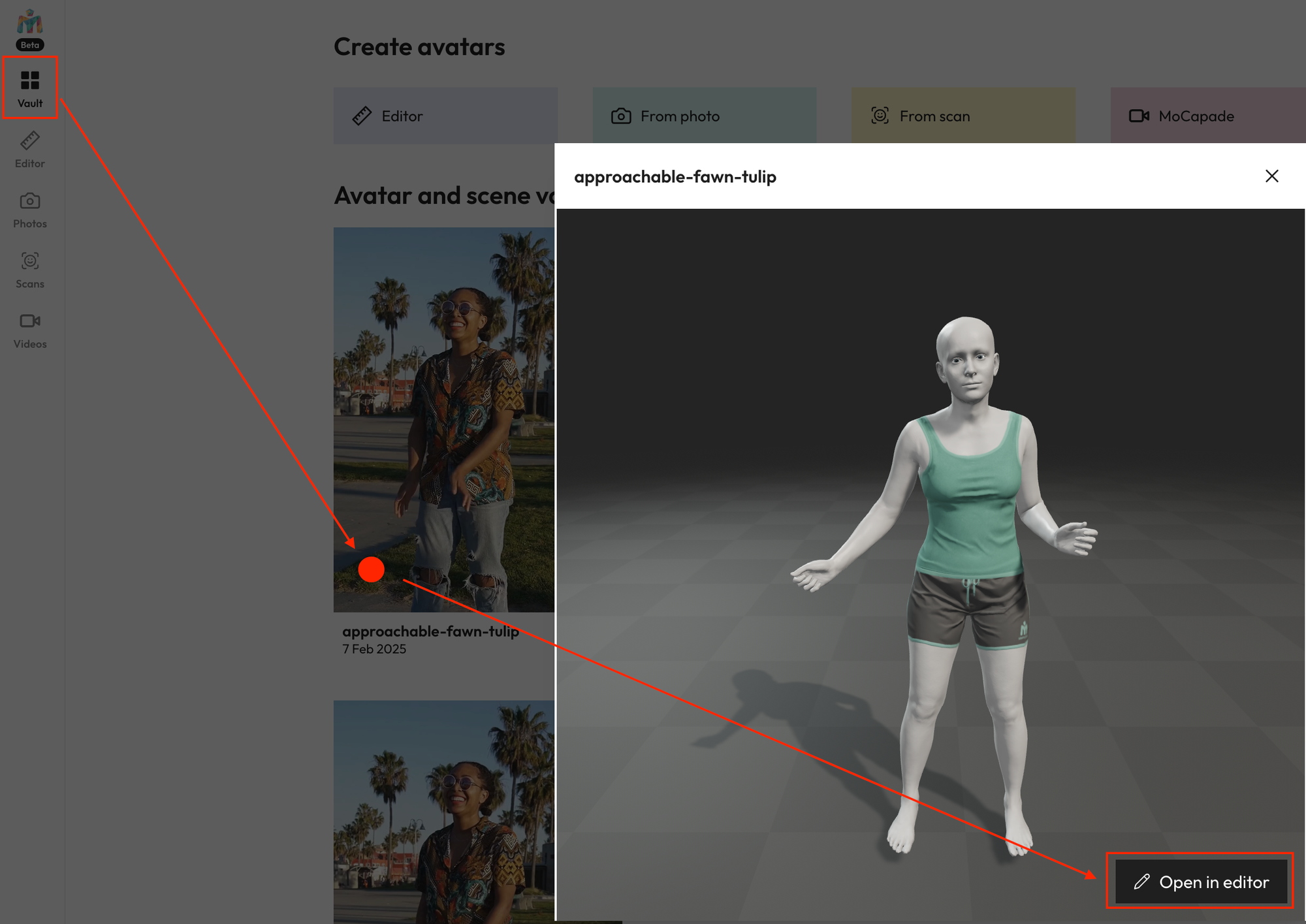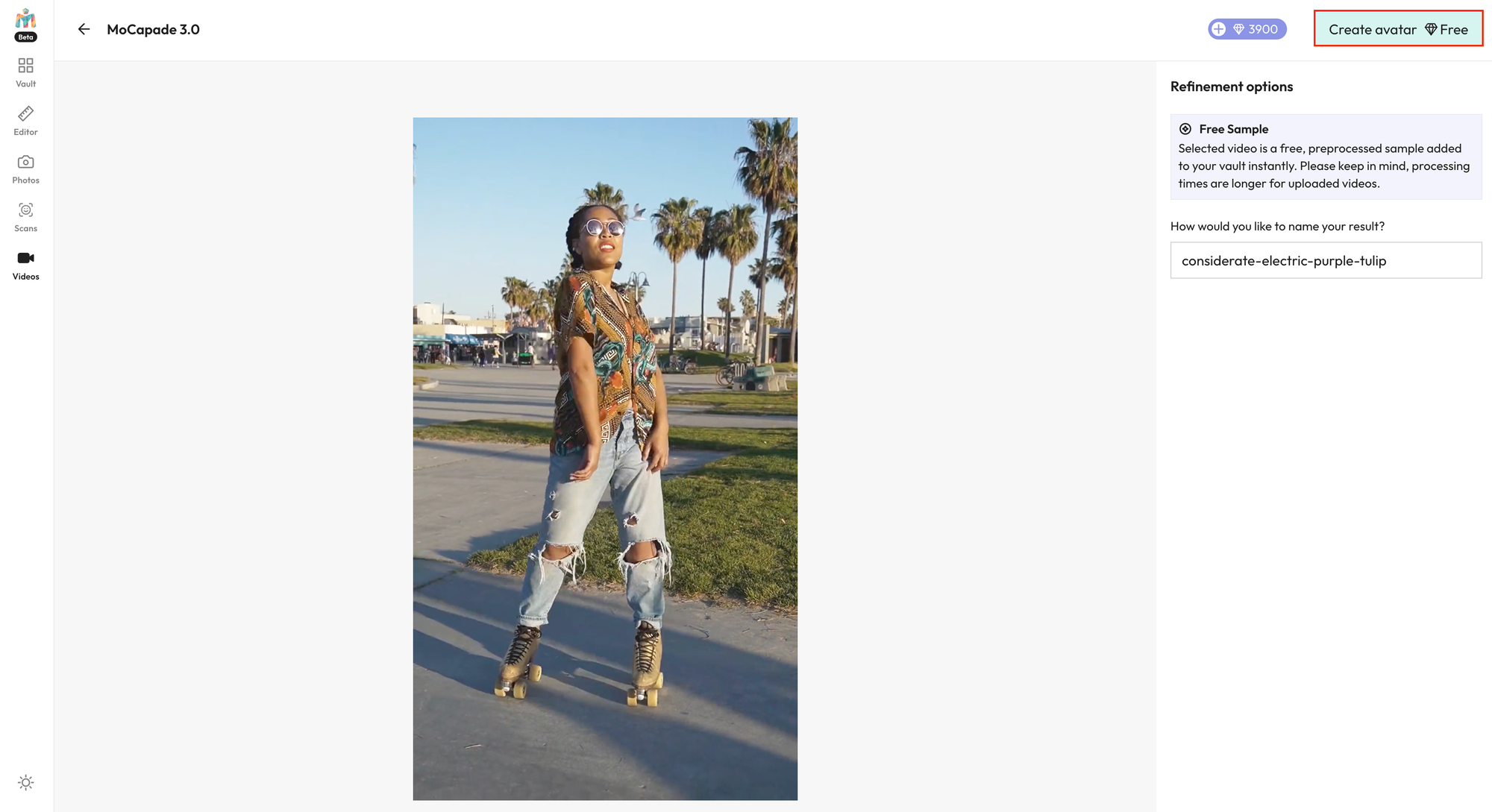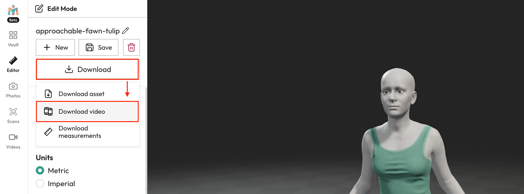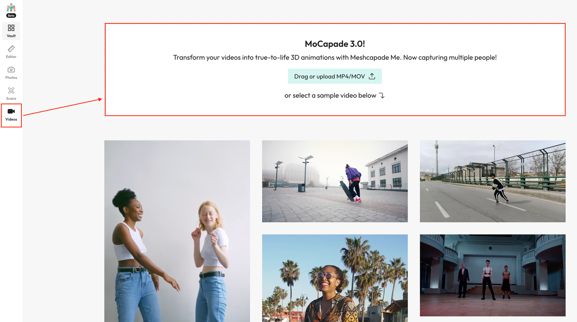 Meshcapade ํ์ด์ง์ ์ผ์ชฝ ์ฌ์ด๋์์ 'Videos'๋ฅผ ํด๋ฆญํ์๋ฉด ์๋์ ๊ฐ์ด ์์์ ์ ๋ก๋ํ์ฌ 3D ํด๋จผ ์ ๋๋ฉ์ด์ ์์์ ์์ฑํ ์ ์์ต๋๋ค.