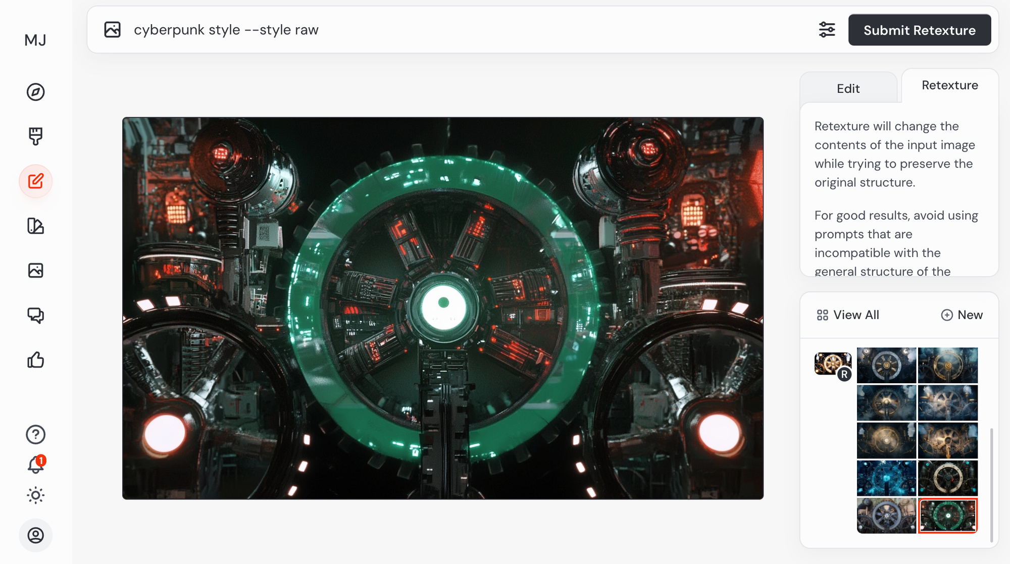 Midjourney์ 'Edit' ๋ฉ๋ด๋ก ์ด๋ํ ๋ค, 'Retexture'๋ฅผ ์คํํฉ๋๋ค.* Retexture์์ ์ฒซ ํ๋ ์ ์ด๋ฏธ์ง๋ฅผ ์