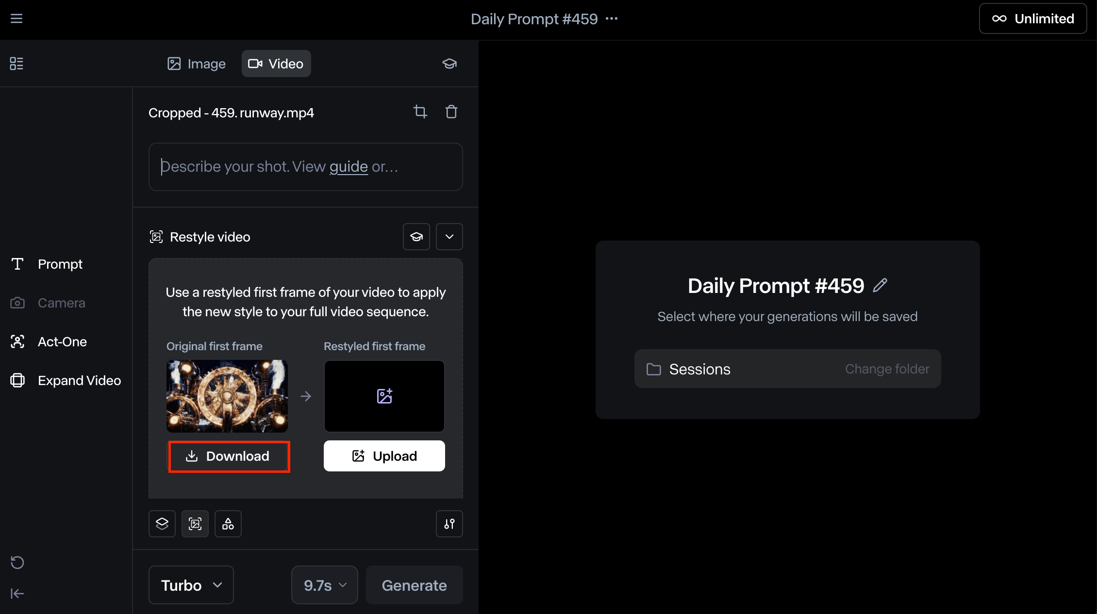 Retexture๋ฅผ ์ ์ฉํ ์ด๋ฏธ์ง๋ฅผ ๋ค์ด๋ก๋ ๋ฐ์ Runway์ ์ ๋ก๋ํ๊ณ 'Generate' ๋ฒํผ์ ํด๋ฆญํ์ฌ ์์ฑํฉ๋๋ค.