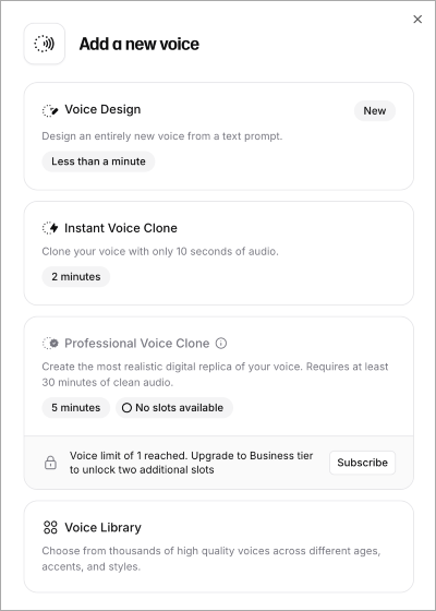κΈ°μ‘΄μ μ 곡λλ Instant Voice Cloning μλΉμ€κ° μ§§μ μμ±λ§μΌλ‘ λΉ λ₯΄κ² ν΄λ‘λμ΄ κ°λ₯ν λμ μ λ°λλ λ¨μ΄μ‘λ λ°λ©΄, Professional Voice Cloningμ λ λ§μ μμ± λ°μ΄ν°λ₯Ό μ λ ₯νμ¬ λ§€μ° λμ μ νλλ‘ μμ±μ μ¬νν©λλ€.