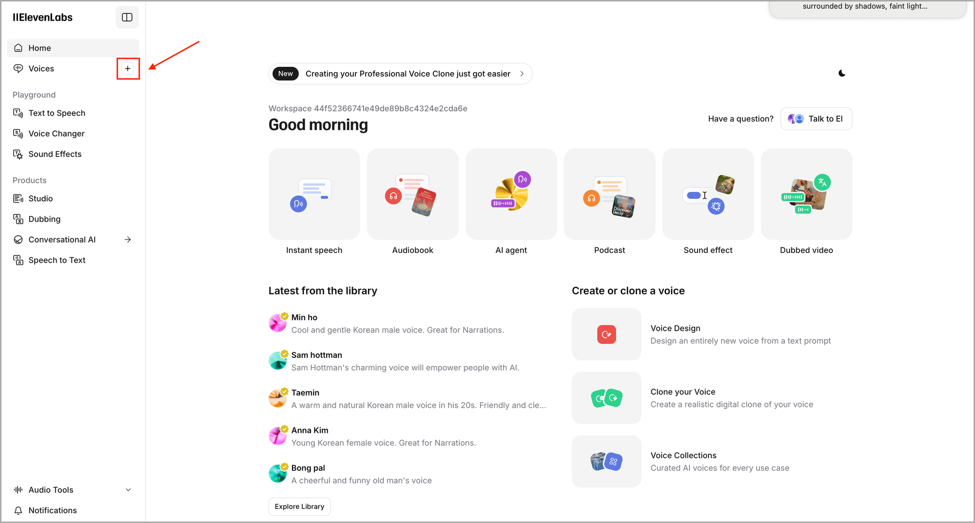 Professional Voice Cloningμ μ¬μ©ν΄λ³΄μλ €λ©΄, Elevenlabs νμκ°μ /λ‘κ·ΈμΈ ν Voices μμ μλ '+' λ²νΌμ ν΄λ¦ν©λλ€.