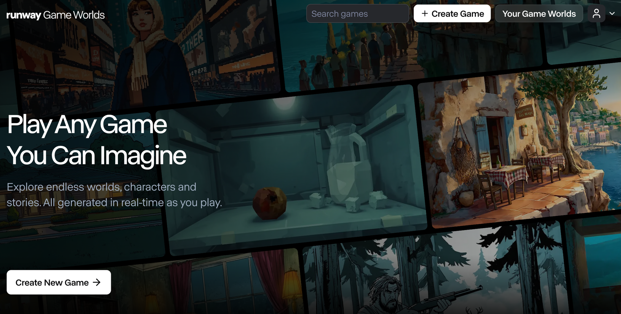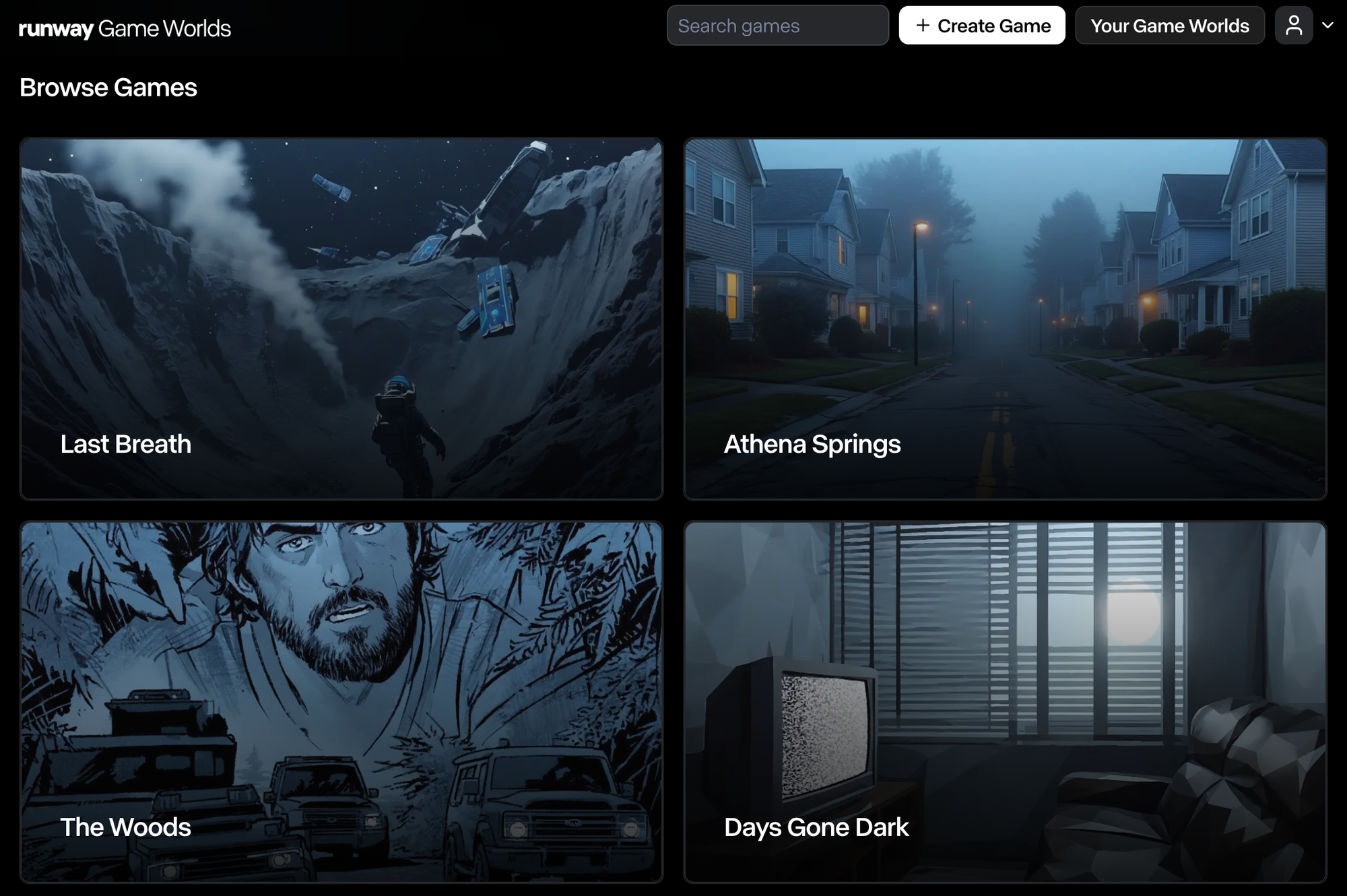 Runwayμμ ν¬λ¦¬μμ΄ν°λΈ ννΈλ(Creative Partners) λμμΌλ‘ 'κ²μ μλ(Game Worlds)'λΌλ νμ΄μ§λ₯Ό μ 곡κ°νμ΅λλ€. μ΄λ―Έμ§μ μμ μμ±μ μ΄μ΄ λ€μ μμ±μ 'μλ μμ±'μΌλ‘ ν₯ν΄κ°λ κ±Έ λ³΄μ€ μ μμ΅λλ€.