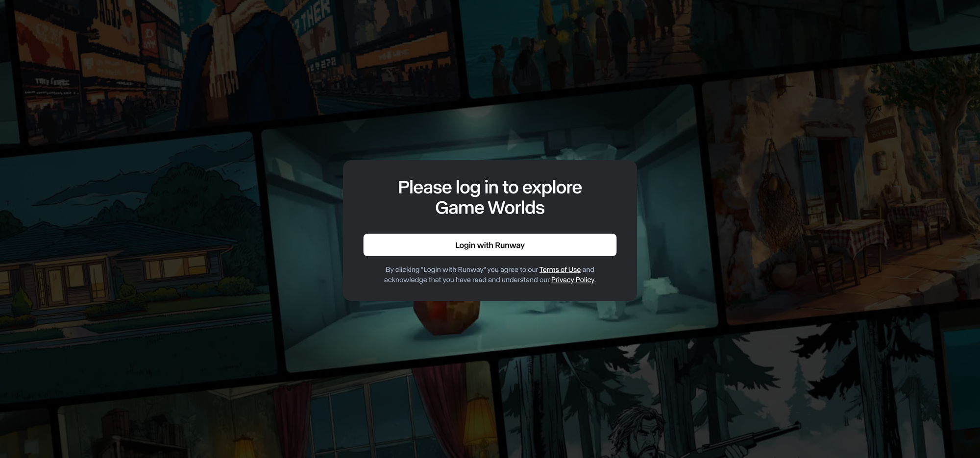Runwayμ Game Worldsμ μ μνλ©΄ μλμ κ°μ΄ λ‘κ·ΈμΈ νμ΄μ§κ° λμ€λλ°μ, Creative Partnersκ° μλ κ²½μ° λ‘κ·ΈμΈμ΄ μμ λμ§ μμ΅λλ€.
