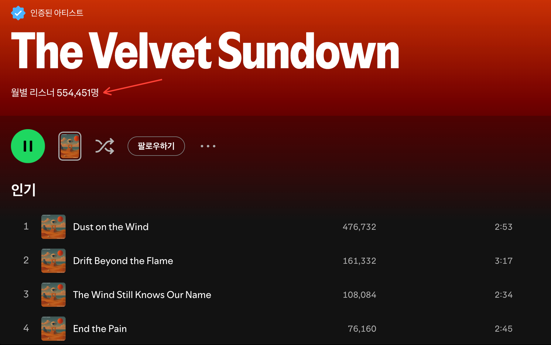 AI Band 'The Velvet Sundown'μ μΈκΈ°κ° λμ΅λλ€. κΈ°μ¬κ° λ°νλ μμ μλ Spotify μλ³ λ¦¬μ€λκ° 40λ§λͺ λμλ€λ©΄, μ§κΈμ 55λ§λͺ μ κΈ°λ‘νκ³ μμ΅λβλ€.