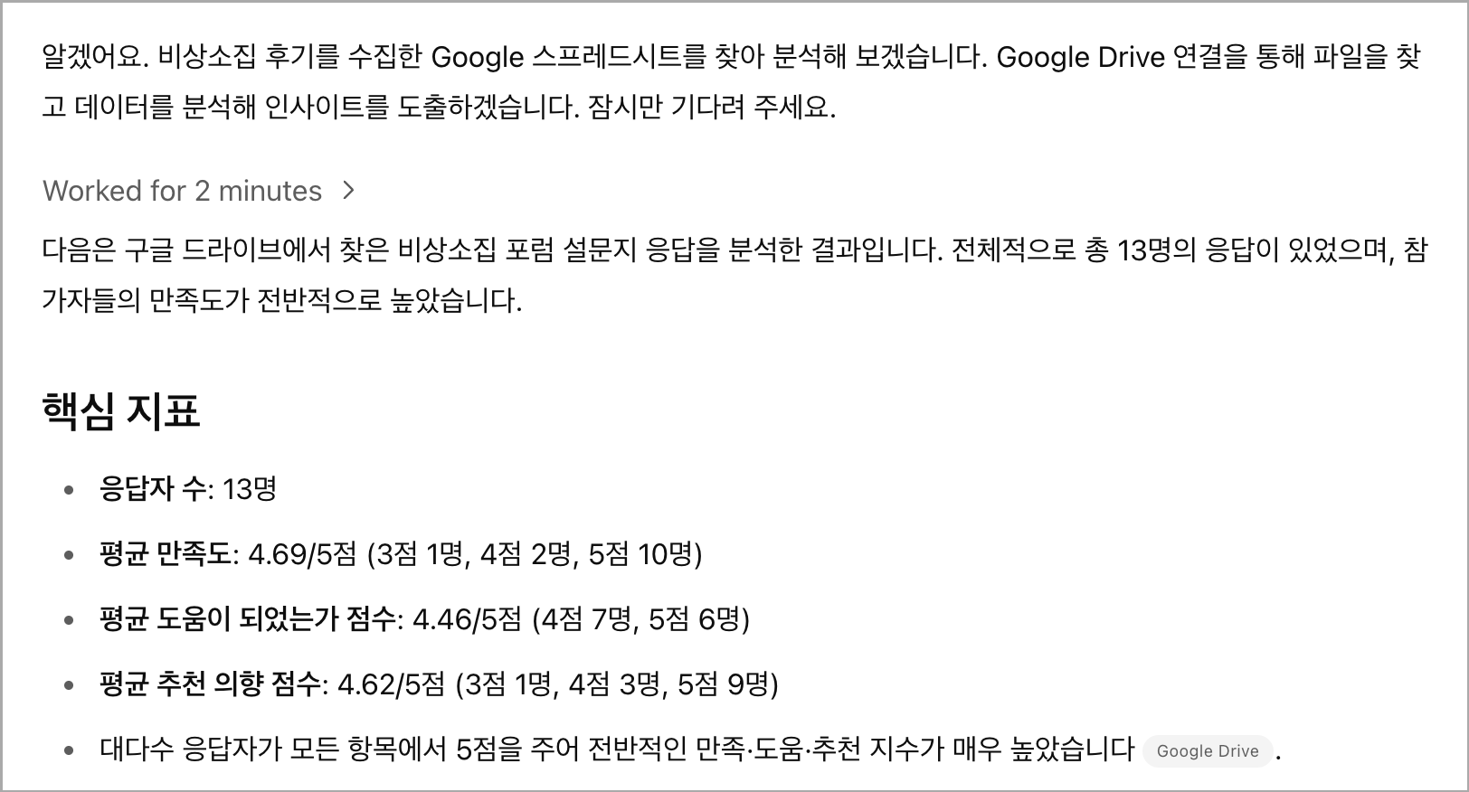 Agent Modeμμ κ΅¬κΈ λλΌμ΄λΈλ₯Ό μμ€λ‘ μ ννλ©΄, λλΌμ΄λΈμ μλ νμΌμ μ½κ³ λΆμνλ κ²μ΄ κ°λ₯ν©λλ€. μ΄λ₯Ό κΈ°λ°μΌλ‘ μ€νλ λ μνΈλ₯Ό λ§λ€κ±°λ λ°ν μ¬λΌμ΄λλ₯Ό λ§λλ κ²λ κ°λ₯ν©λλ€.