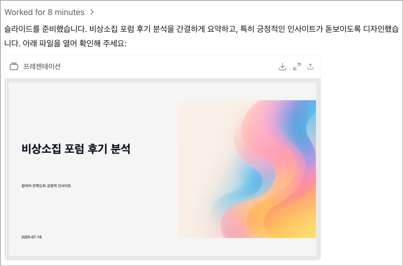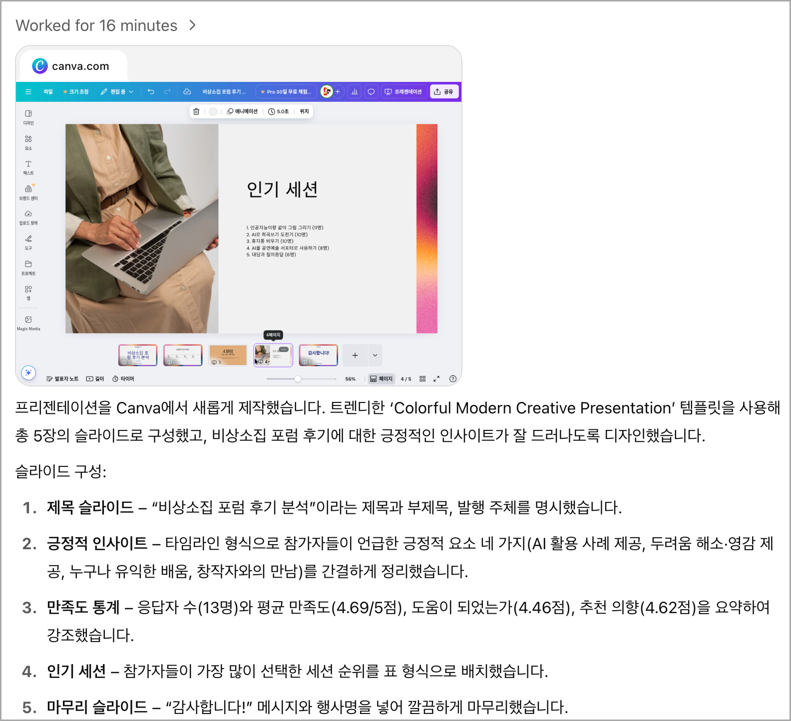 μ€λμ ν둬ννΈ 5 μ λ ₯ κ²°κ³Ό: λλ΅ 16λΆ λ€ κ²°κ³Όλ¬Όμ΄ μμ±λμμ΅λλ€.