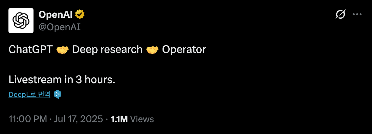 OpenAIμμ μ¬λ¦° X ν¬μ€νΈλ₯Ό 보면, ChatGPT + μ¬μΈ΅ 리μμΉ(Deep research) + μ΄μμ(Operator)κ° ν©μΉ κΈ°λ₯μ΄λΌκ³ μ€λͺ ν©λλ€.