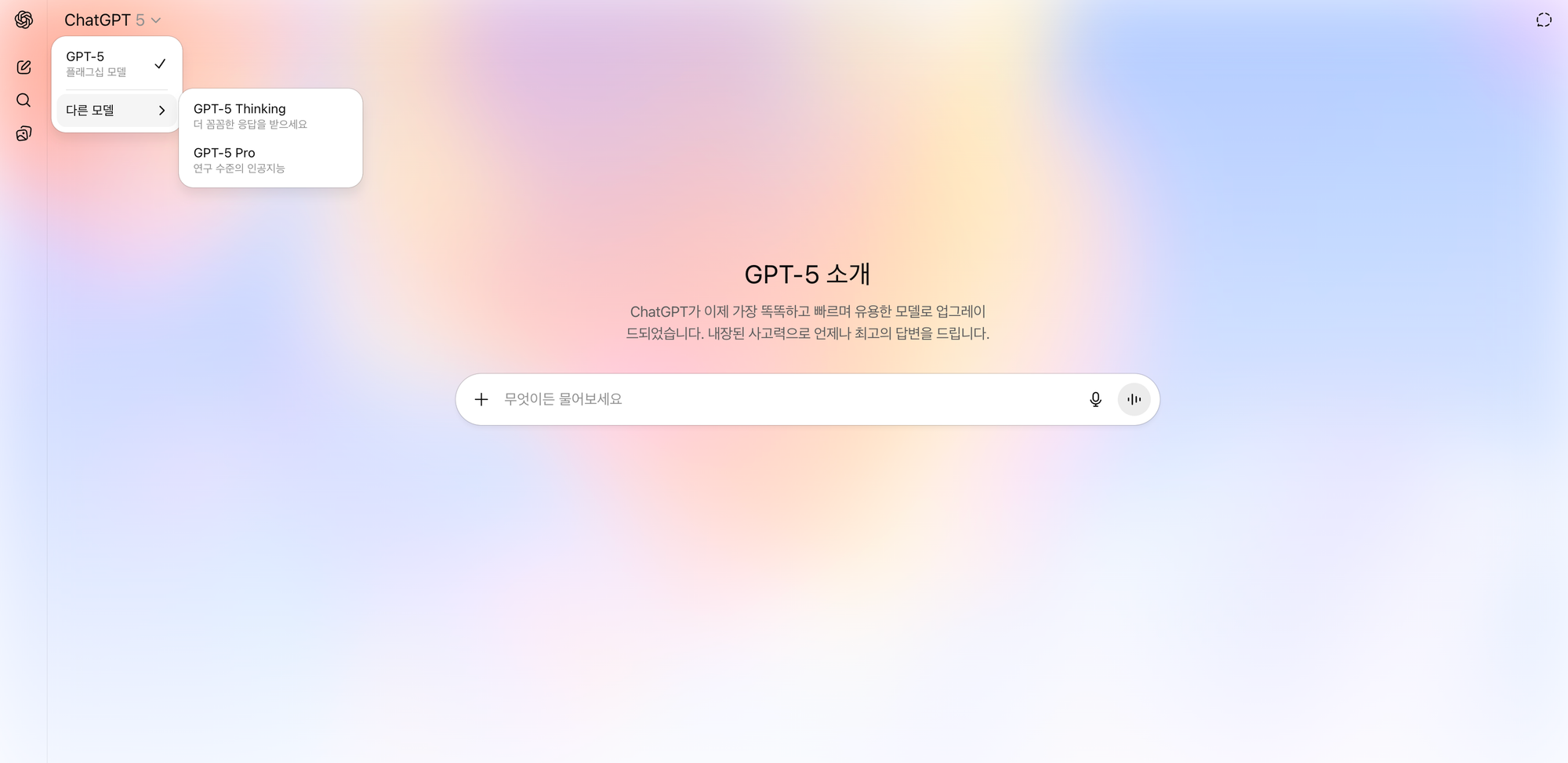 - GPT-4o, o3, o4-mini ๋์ GPT-5: ๊ธฐ์กด์ GPT-4o, o3, o4-mini, o4-mini-high, GPT-4.5 ๋ฑ ์ฌ๋ฌ๊ฐ์ง ๋ชจ๋ธ ๋์ GPT-5 ๋๋ GPT-5 Thinking ๋ ๊ฐ์ง๋ง ๋ํ๋ฉ๋๋ค. Pro ๊ตฌ๋ ์ ํ ๊ฒฝ์ฐ GPT-5 Pro ๋ชจ๋ธ์๋ ์ ๊ทผ ๊ฐ๋ฅํฉ๋๋ค.
