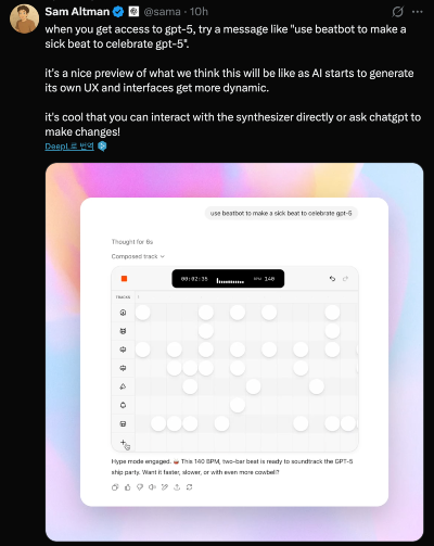 GPT-5๋ฅผ ์ฌ์ฉํ๋ฉด ์ด๋๊น์ง ๊ฐ๋ฅํด์ง๊น์? ๋จผ์ โX์ ์ ์ํธ๋งจ์ด ์ถ์ฒํ ํ๋กฌํํธ๋ฅผ ์ ๋ ฅํด๋ณด์์ต๋๋ค.