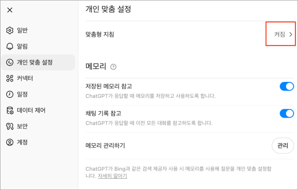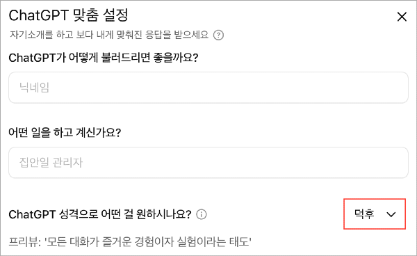 ChatGPT ๋ง์ถค ์ค์ ์ฐฝ์ด ๋จ๋ฉด ์ฑ๊ฒฉ์ ์ง์ ํ ์ ์์ต๋๋ค.