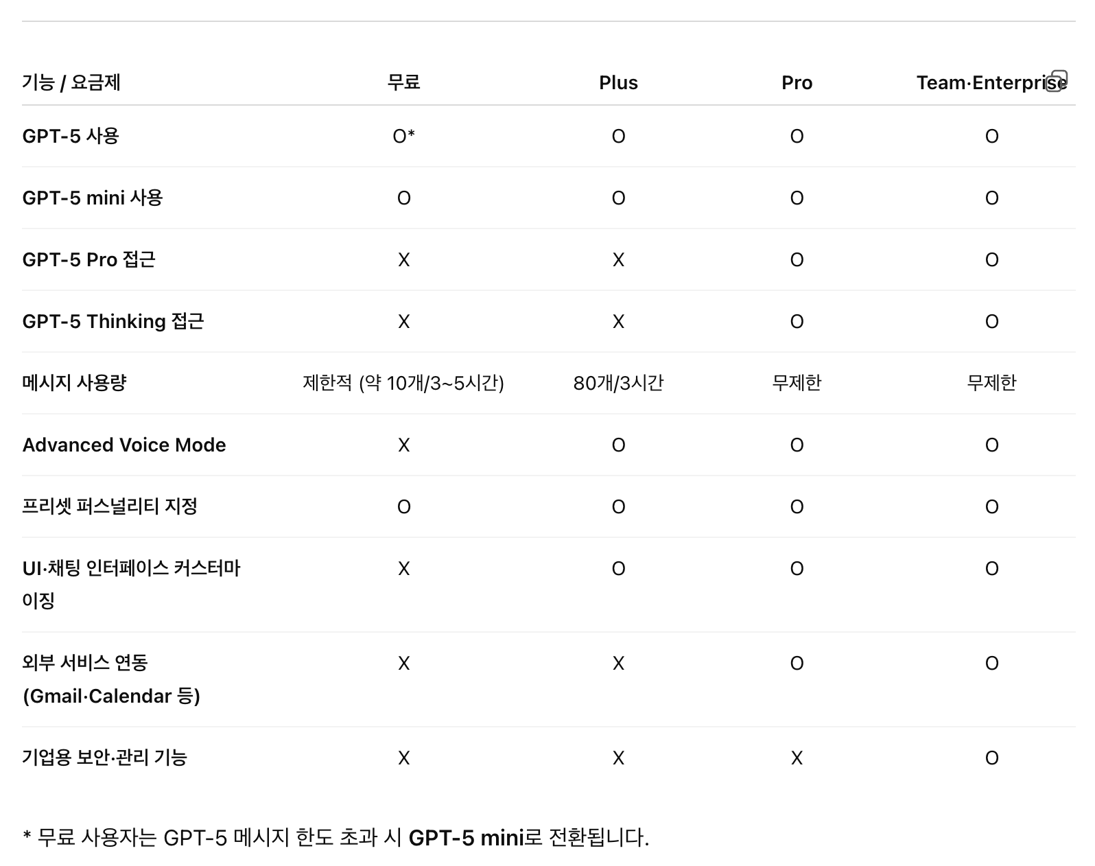 - ๋ฌด๋ฃ ๋ฒ์ ์์๋ ์ฌ์ฉ๊ฐ๋ฅ: ๋ฌด๋ฃ ๊ตฌ๋ ์๋ GPT-5๋ฅผ ์ฌ์ฉํ ์ ์์ต๋๋ค. ์ด๋ ์ ๋ ๋ต๋ณ์ ๋ฐ์ ๋ค์๋ GPT-5 mini๋ก ์ ํ๋ฉ๋๋ค. ๋ํ ์ ๋ฃ ๊ตฌ๋ ์ ์์ฑ๋ชจ๋๋ฅผ ๊ฑฐ์ ๋ฌด์ ํ์ผ๋ก ์ฌ์ฉํ ์ ์๊ฒ ๋์์ต๋๋ค.