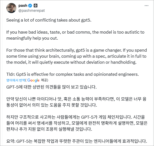 ๊ณผ ์ฌ์ฉ ๊ฒฝํ: ๋ด์ค๋ ํฐ๋ฅผ ๋ฐํํ ํ ๋ฉฐ์น ๋ GPT-5๋ฅผ ์จ๋ณด๋, ์์ ์ธ๊ธ๋ ๋ถ๋ง์ ์ด๋ ์ ๋ ๊ณต๊ฐํฉ๋๋ค. ์ ๋ ๊ธ์ ์ธ ๋ GPT-4.5 ๋ชจ๋ธ์ ์์ฃผ ์ฌ์ฉํ๋๋ฐ, GPT-5๋ฅผ ์ฌ์ฉํด๋ณด๋ ์ด์ ์ด๋ผ๋ฉด ๋ฐ์ํ์ง ์์ ๋ฒํ ๋ถ๋ถ์์ ํ ๋ฃจ์๋ค์ด์