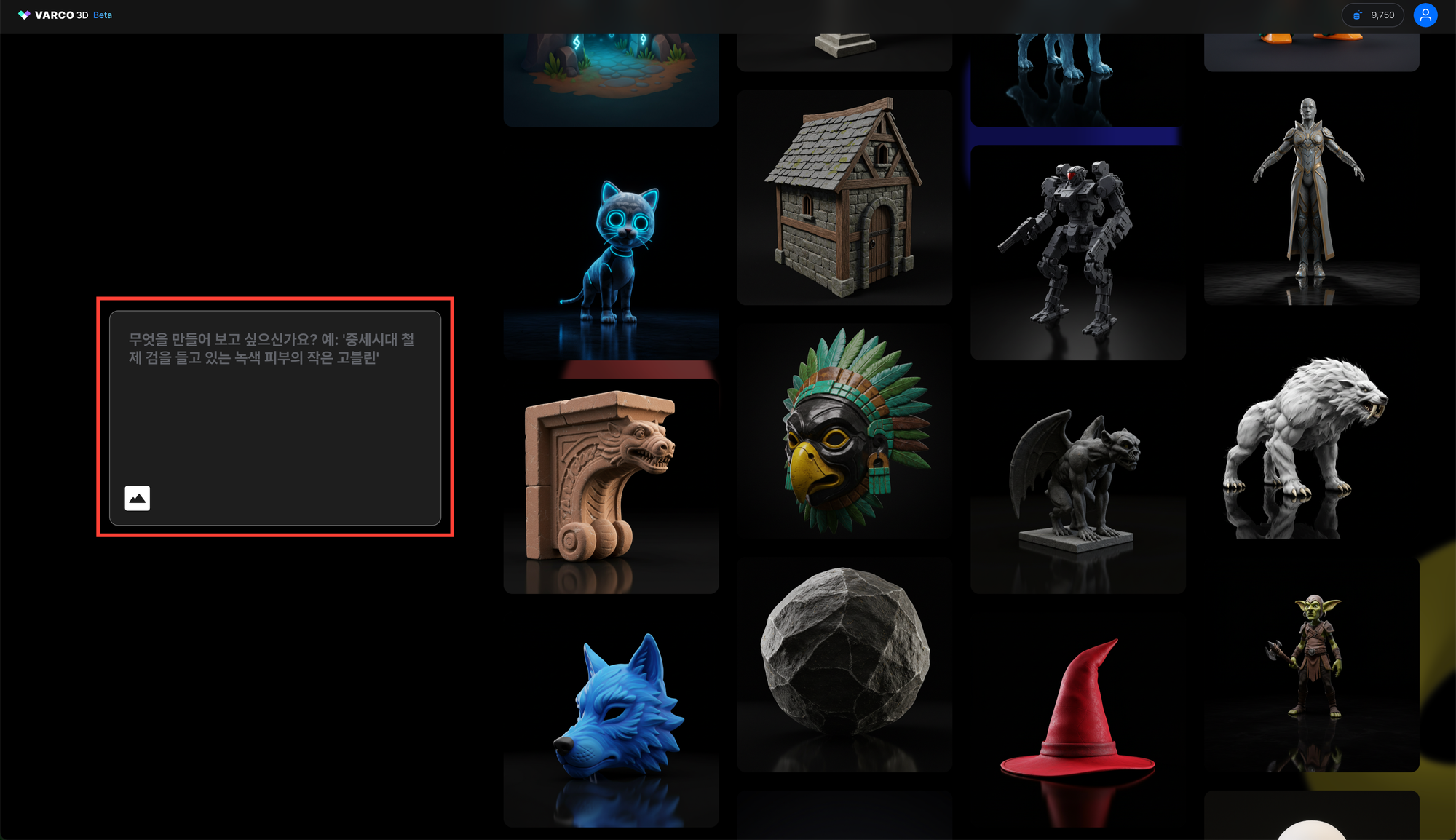 ๋ค์ํ 3D ์ด์ ์ ์์ฑํด๋ณด์๋ ค๋ฉด VARCO 3D ํ์ด์ง์ ํ์๊ฐ์ /๋ก๊ทธ์ธ ํ, ์๋ ๋ถ์์ ๋ฐ์ค๋ก ํ์๋ ๊ณณ์ ํ๋กฌํํธ๋ฅผ ์ ๋ ฅํฉ๋๋ค.