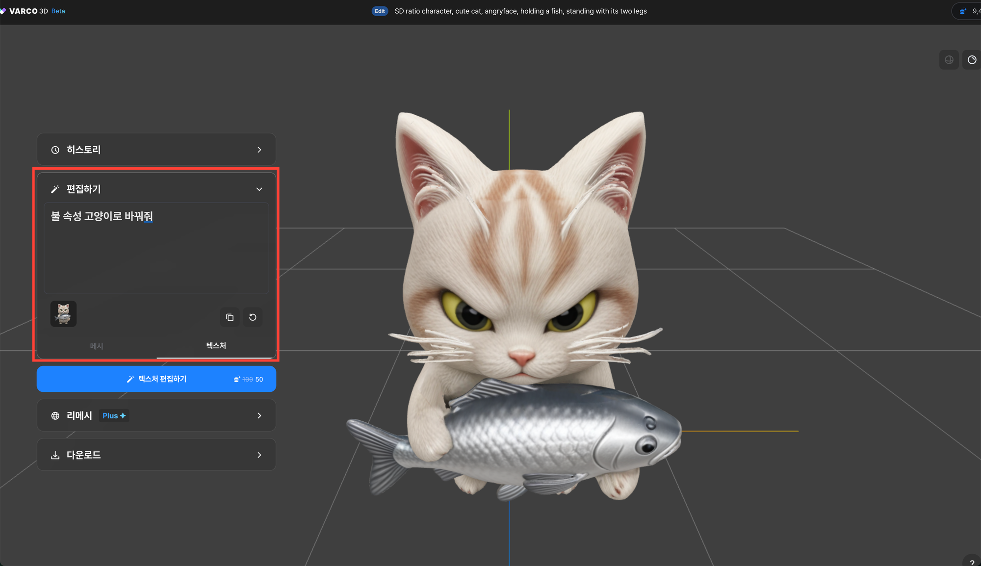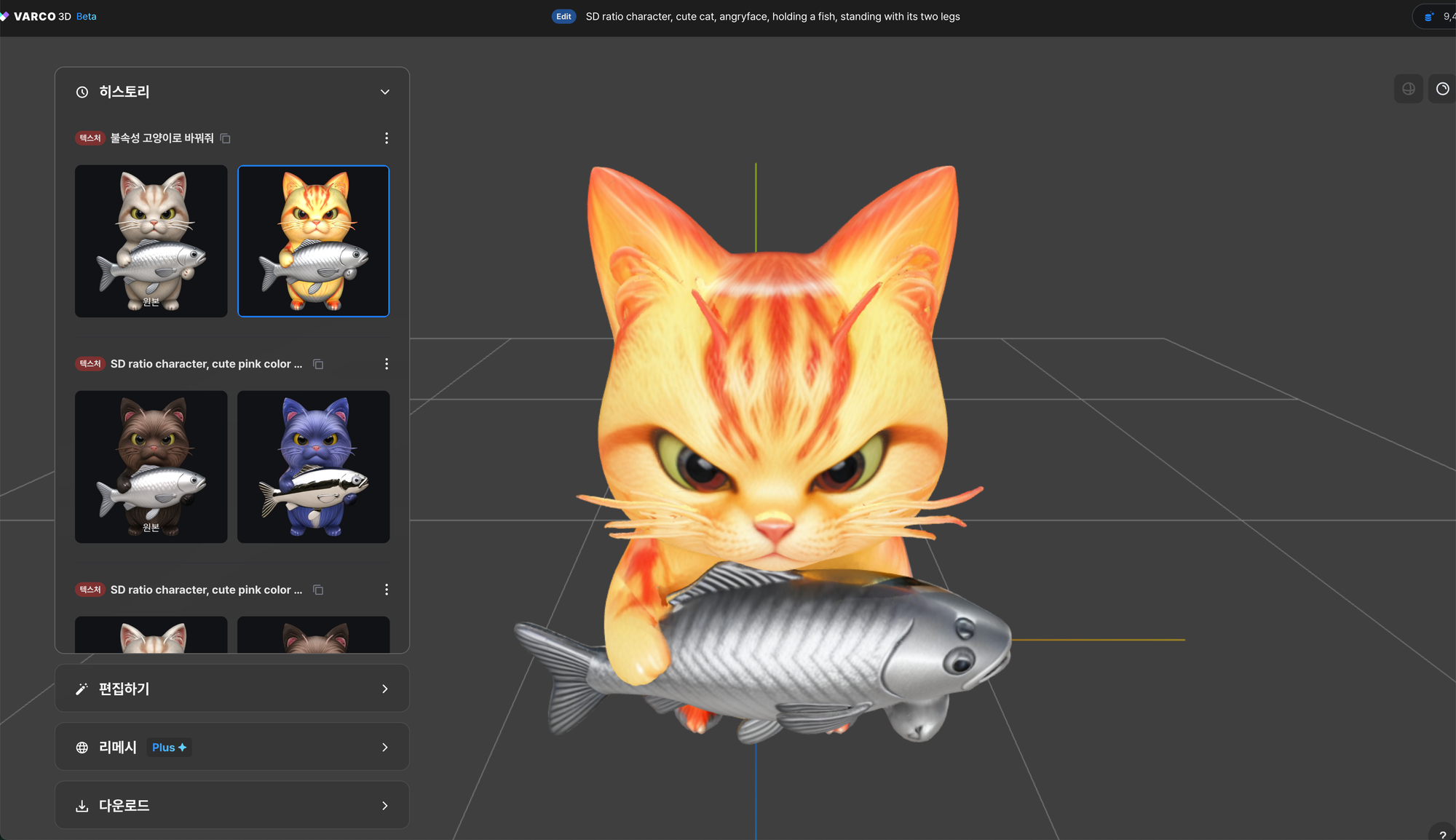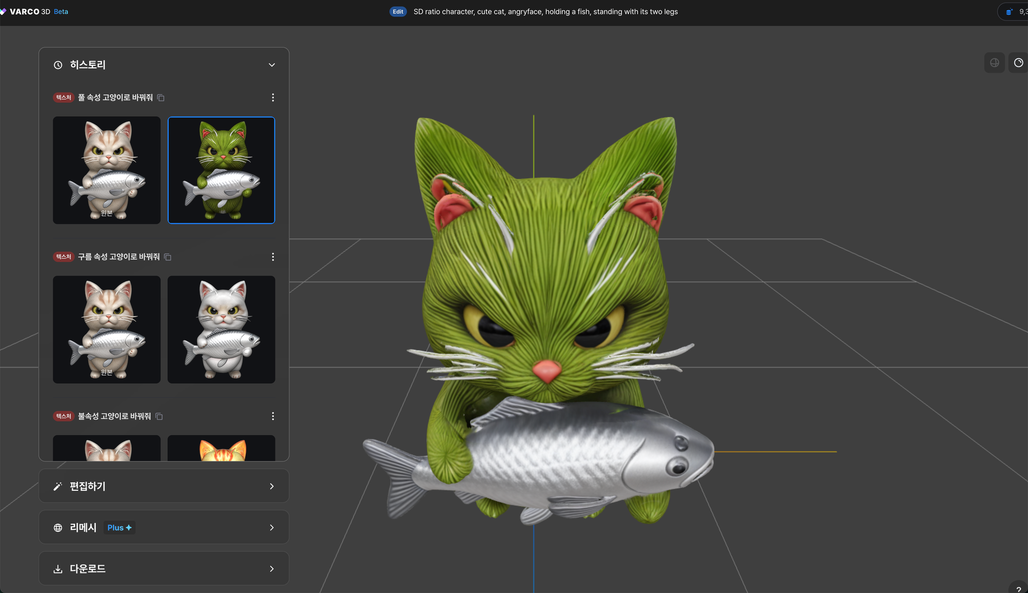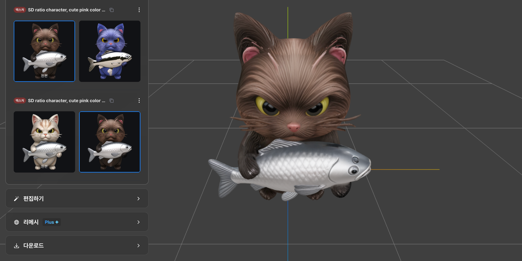 ๊ฐ์ฅ ํฅ๋ฏธ๋ก์ด ๊ธฐ๋ฅ์ 'ํธ์งํ๊ธฐ' ๊ธฐ๋ฅ์ ๋๋ค. ์์ฑํ 3D ์ด์ ์ ์ฌ๋ฌ ์์์ ๋ง๋ค ์ ์๋ ๊ธฐ๋ฅ์ธ๋ฐ์, ์์ ํ ํ ์คํธ ํ๋กฌํํธ๋ฅผ ๋ฐ๋ฅด๊ธฐ๋ณด๋ค ์ด์ ์์ฒด์ ์์ฑ์ ๋ณํํด๋ฌ๋ผ๊ณ ํ ๋ ์ ๋ฐ์๋๋ ๊ฒฝํฅ์ด ์์ต๋๋ค.