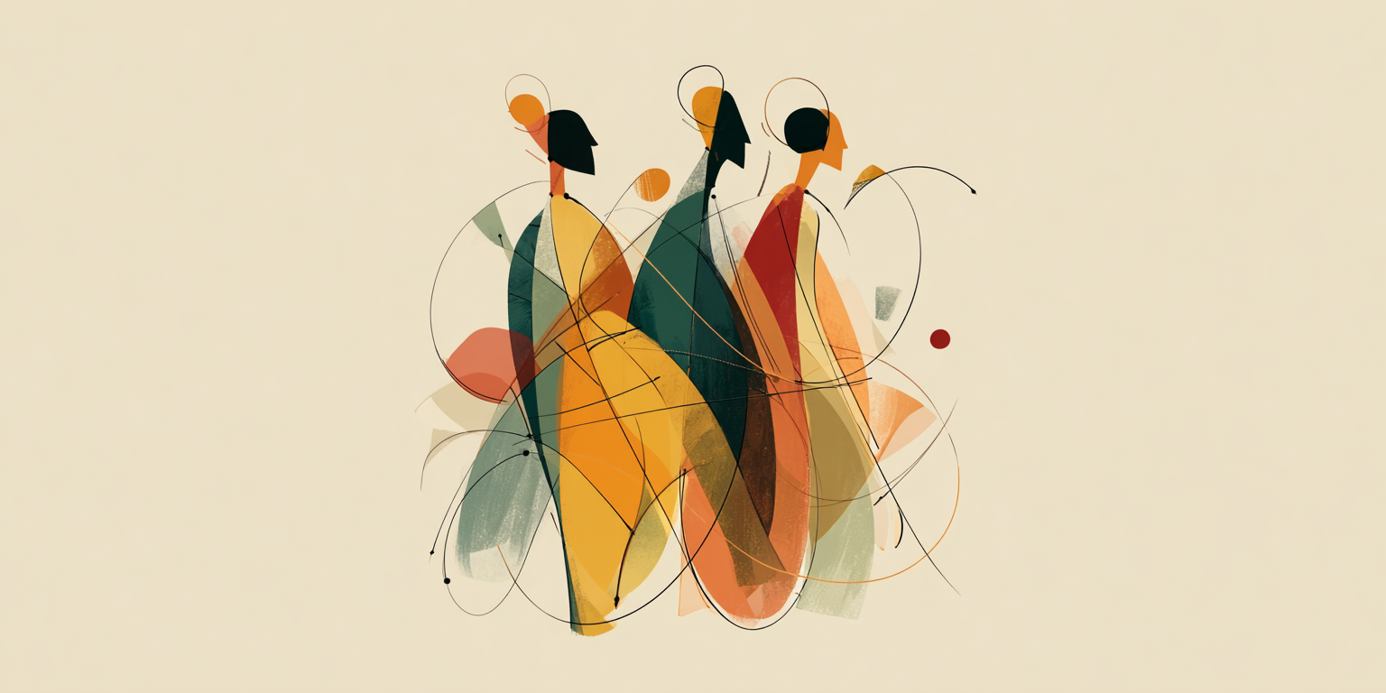an abstract representation of human reciprocity, familial love, depicted through three distinct phases or layers, each layer adding complexity and depth to the relationships, using soft natural colors, elegant lines, subtle symbolic forms, with characters wearing futuristic clothing --chaos 10 --ar 2:1 --raw --sref https://s.mj.run/5fhbT3LoNHI --sw 5 --stylize 150