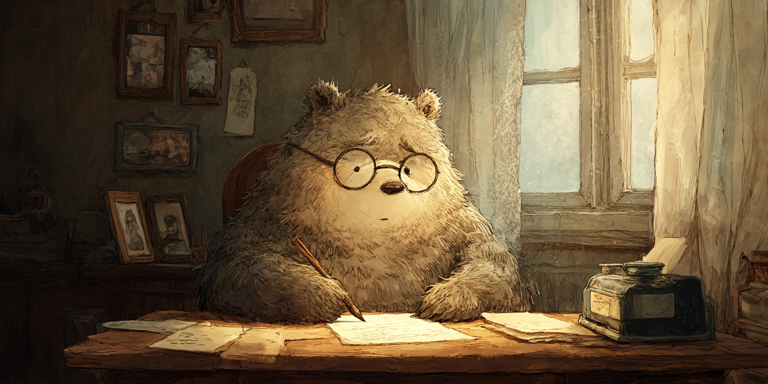 a large, chubby bear with round glasses, seated at a rustic wooden desk in a cozy room, writing a heartfelt letter filled with longing for a distant loved one, visibly sad and lonely expression, soft expression of nostalgia, warm ambient window light, watercolor painting style with delicate brush strokes, muted earthy tones, gentle and serene atmosphere, subtle background details like framed photos and soft curtains --chaos 10 --ar 2:1 --raw --stylize 150