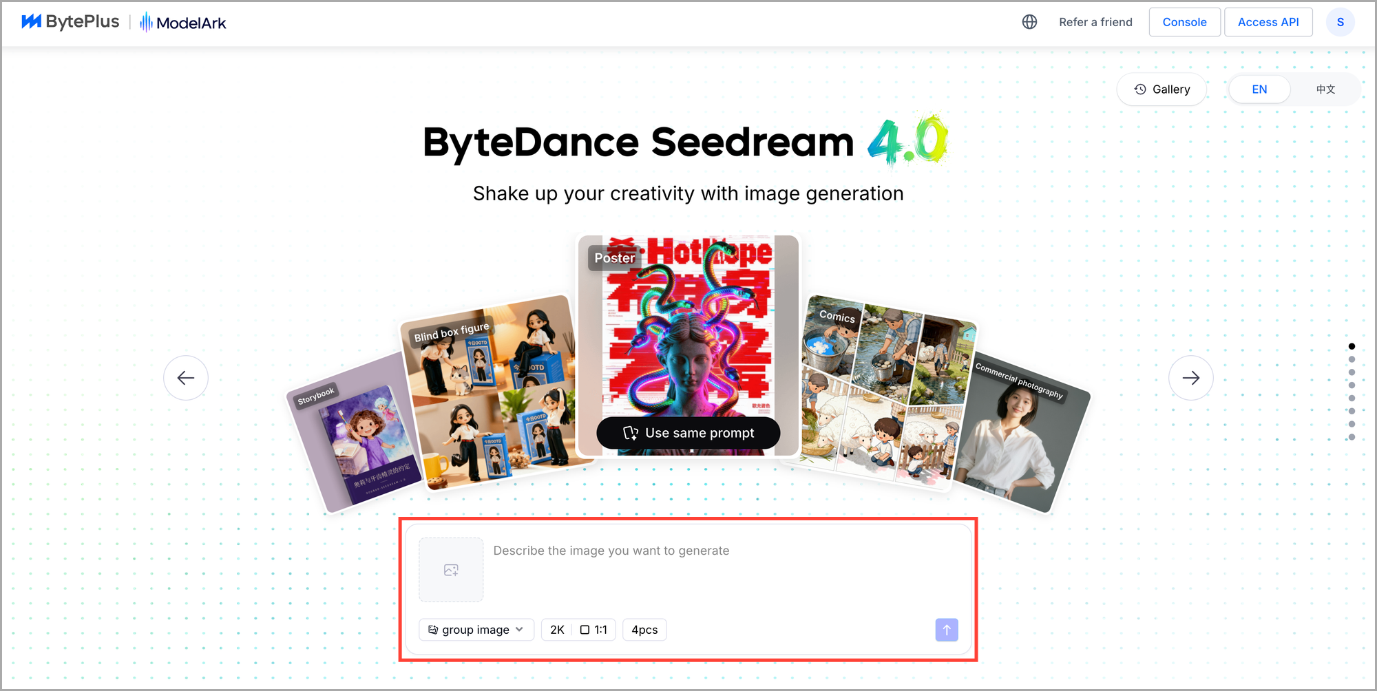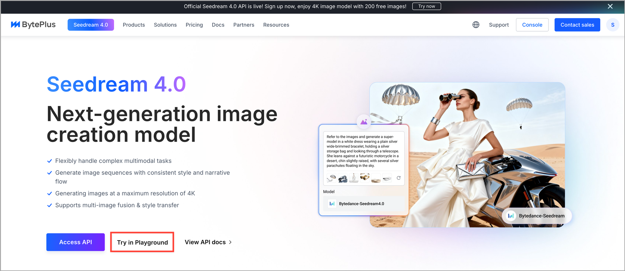 μ¬κΈ°λ₯Ό ν΄λ¦νμλ©΄ Bytedance νμ¬μμ μ΄μνλ 곡μ νμ΄μ§μμ Seedream 4.0μ μ¬μ©ν΄λ³Ό μ μμ΅λλ€(νμκ°μ ν 200μ₯ λ¬΄λ£ μ΄λ―Έμ§ μμ± κ°λ₯). μλμ κ°μ΄ νμ΄μ§μ μ μν λ€ 'Try in Playground'λ₯Ό ν΄λ¦ν©λλ€.