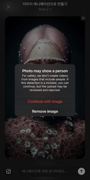 - SORA 2λ₯Ό μ¬μ©νλ©΄ ν μ€νΈμ μ΄λ―Έμ§μμ μμμ μμ±ν μ μλλ°μ, λ±λ‘λ μΉ΄λ©μ€κ° μλ μ€μ¬ μΈλ¬Ό μ΄λ―Έμ§λ₯Ό μ λ‘λν κ²½μ°, μμ μμ±μ΄ λμ§ μμ΅λλ€. μλ μ΄λ―Έμ§μ νμλ κ²½κ³ λ©μμ§μ λ°λ₯΄λ©΄, μμ±μ΄ λλλΌλ 리뷰λ₯Ό κ±°μ³ μμ λλ€κ³ ν©λλ€. μ¦, λ°λμ μΈλ¬Όμ λ΄ μΌκ΅΄(νΉμ νλ½λ°μ μΉκ΅¬μ μΌκ΅΄)λ§ μ¬μ© κ°λ₯ν©λλ€.