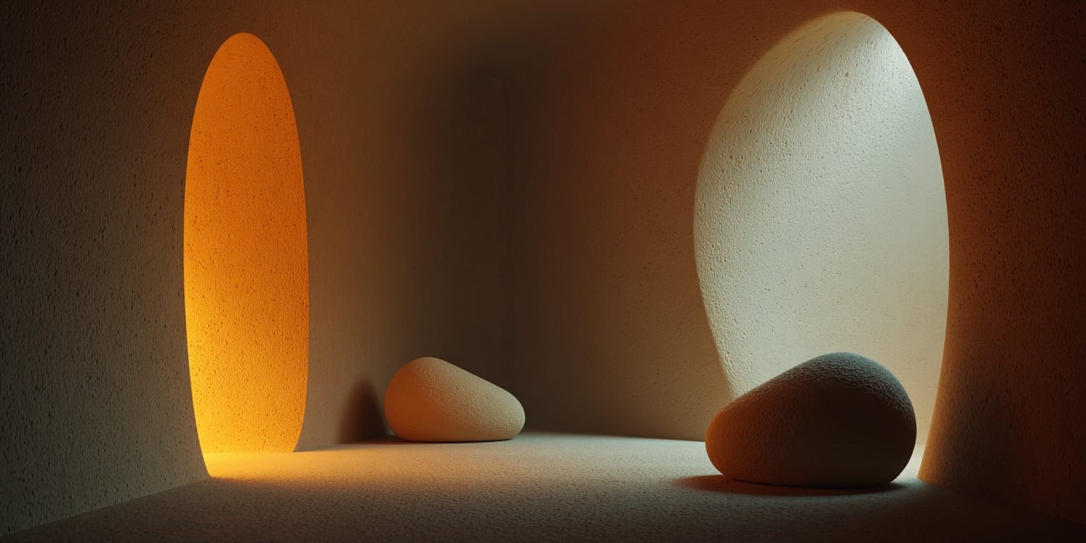 cocoon-like enveloping space, warm amber edge lighting, softly curved walls, felt & linen microtextures, ample negative space for breath, high bokeh, foggy volumetric light, pastel beige-amber, no figures --chaos 5 --ar 2:1 --raw --stylize 150