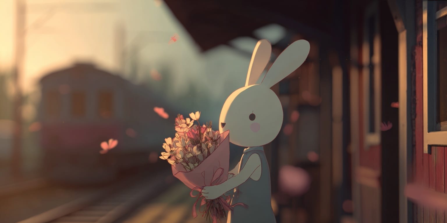 a cute cartoon bunny holding a bouquet of flowers, waiting at a small countryside train station for someone they love, warm afternoon sunlight, soft pastel colors, gentle breeze moving petals, cinematic lighting, heartwarming atmosphere, whimsical storytelling, --ar 2:1 --raw
