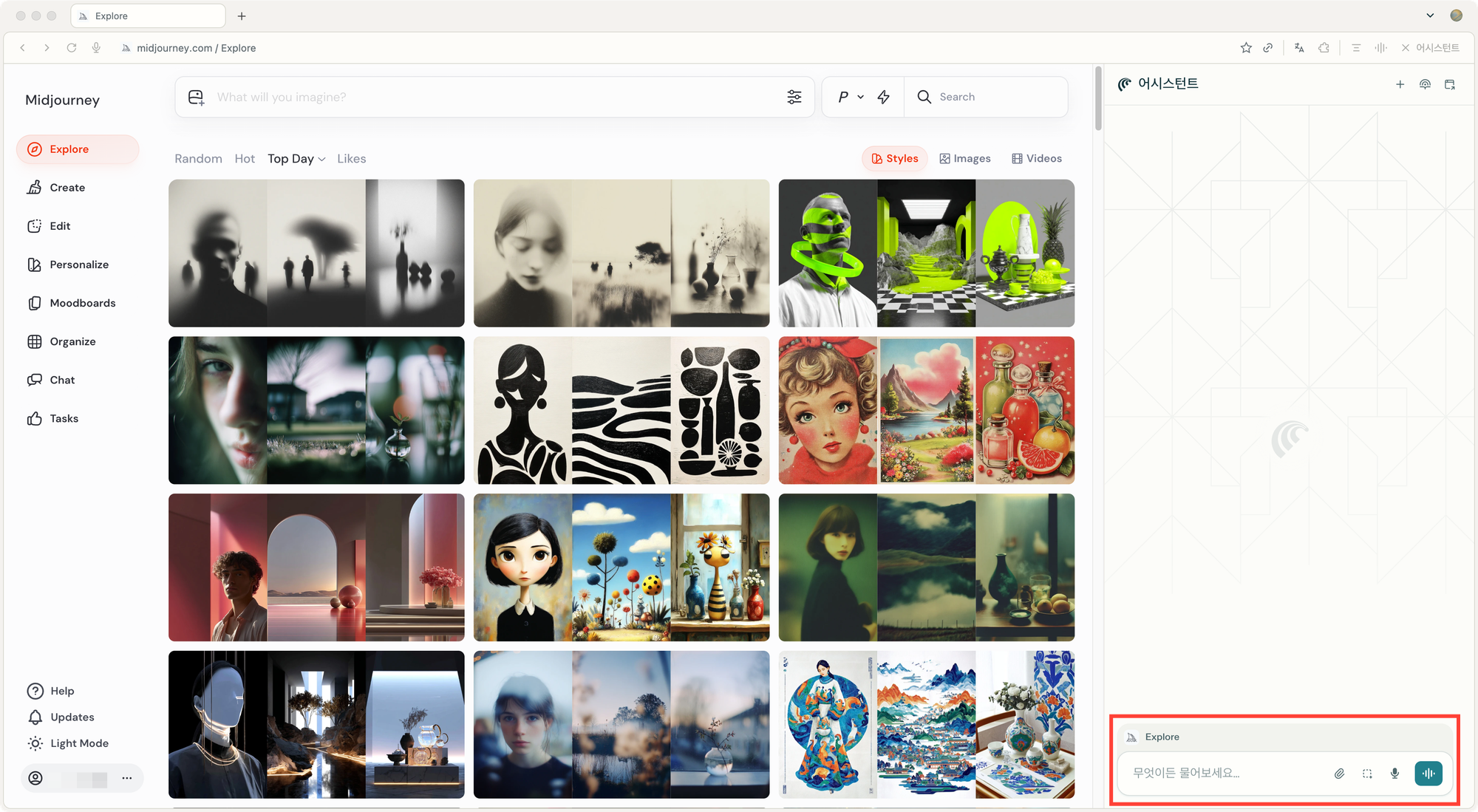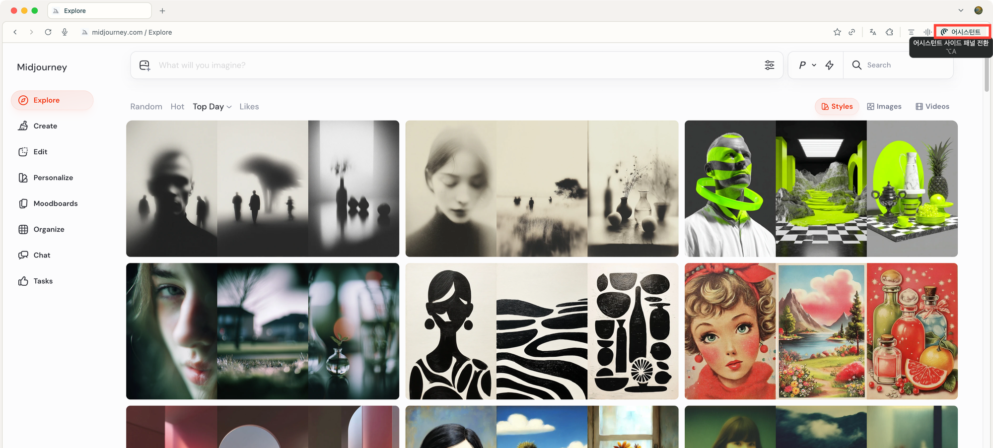 Comet ๋ธ๋ผ์ฐ์ ๋ฅผ ๋ค์ด๋ก๋ ๋ฐ๊ณ ์คํํ ๋ค, midjourney์ ์ ์ํฉ๋๋ค. ๊ทธ๋ฐ ๋ค์, ์ค๋ฅธ์ชฝ ์๋จ '์ด์์คํดํธ' ๋ฒํผ์ ํด๋ฆญํฉ๋๋ค.