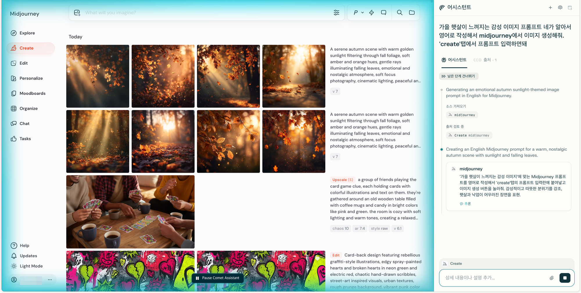 - 'Midjourney์์ ์์ ์์ฑ์ด ๋ค ๋๊ธธ ๊ธฐ๋ค๋ ธ๋ค๊ฐ, ํ ๋ง๋ฅผ ๋ฐ๊ฟ ์๋ก์ด ์ด๋ฏธ์ง๋ฅผ ์์ฑํด์ค'๋ผ๋ ์์ฒญ๋ ์ํํฉ๋๋ค. ์คํํด๋ณด๊ณ ์ ๋ ๊น์ง ๋๋์ต๋๋ค. ์ฌ๊ธฐ์ ์์ฑ ์ ๋ ฅ๊น์ง ํ๋ฉด, ํค๋ณด๋์ ๋ง์ฐ์ค๋ฅผ ์ฌ์ฉํ ํ์๊ฐ ์๊ฒ ๋ฉ๋๋ค. ๊ทธ์ Comet ๋ธ๋ผ์ฐ์ ๊ฐ ์ด๋ค์ง ํ์๋ง ํ๋ คํ๋๋ฐ, ์ ๋ง ์์ฃผ ์ฌ์ฉํ๊ฒ ๋ ๊ฒ ๊ฐ์ต๋๋ค.