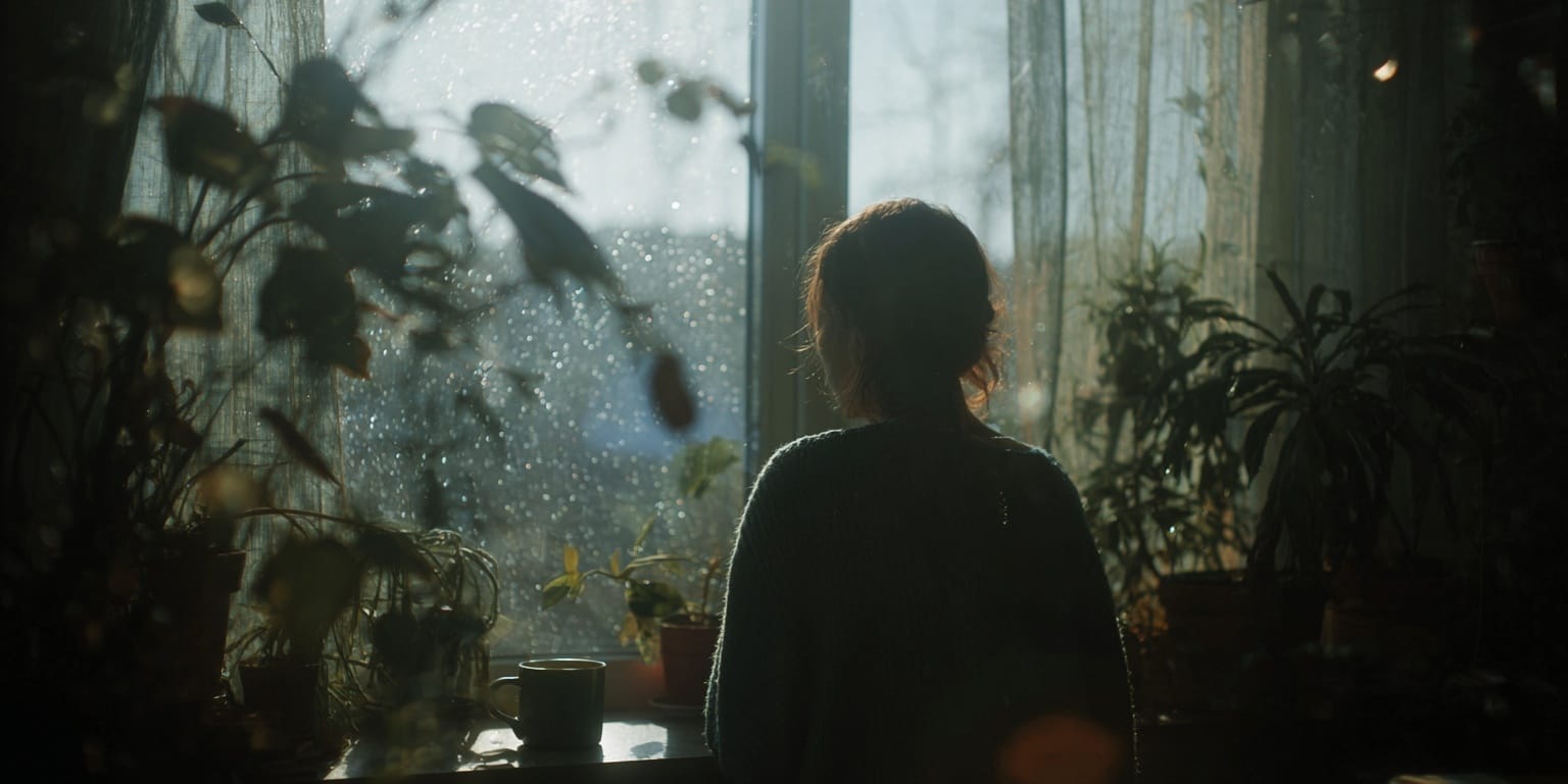 A soft cinematic scene of a person sitting by a window, morning light streaming through sheer curtains, gentle dust floating in the air, a cup of tea steaming nearby, surrounded by houseplants, outside the window soft rain falls slowly, creating ripples on the glass, peaceful and introspective mood, lens flare, pastel tones, shallow depth of field --chaos 5 --ar 2:1 --raw
