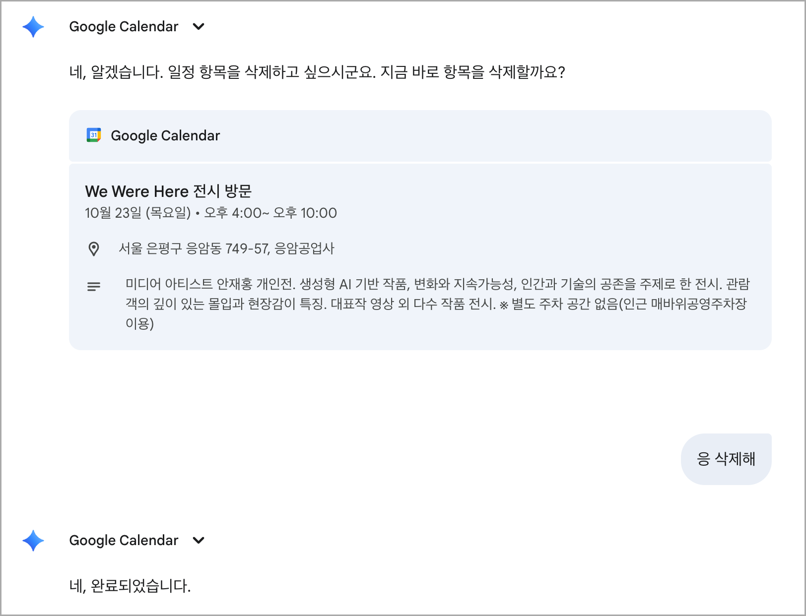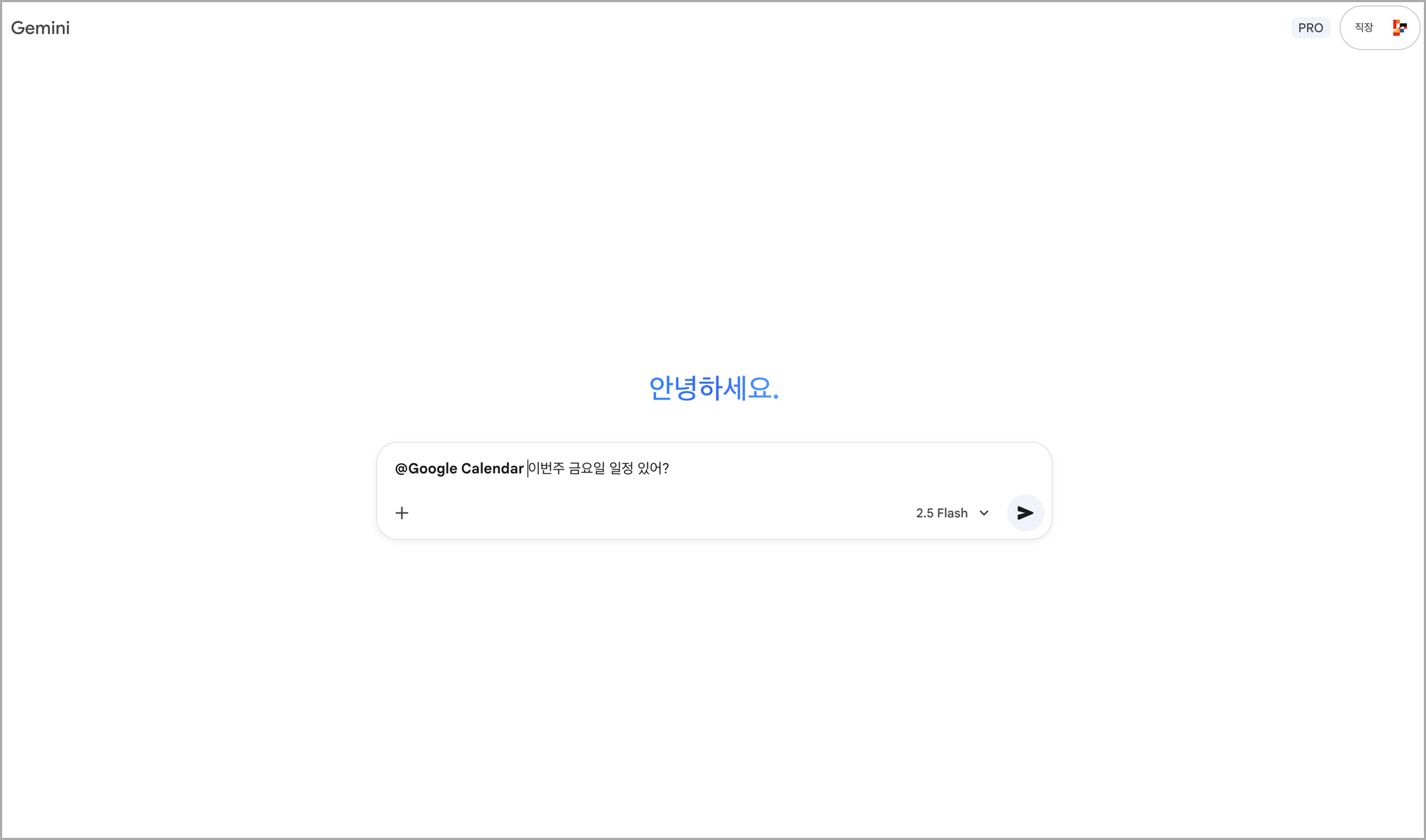 Gemini์์ ์ผ์ ์ ํ์ธํ๋ค, ์ถ๊ฐ ๋๋ ์ญ์ ๋ฅผ ์์ฒญํด๋ณด๊ฒ ์ต๋๋ค. ๊ตฌ๊ธ ๋ก๊ทธ์ธ์ ํ ๋ค, Gemini์์ ๋ค์๊ณผ ๊ฐ์ด ํ๋กฌํํธ๋ฅผ ์ ๋ ฅํฉ๋๋ค.