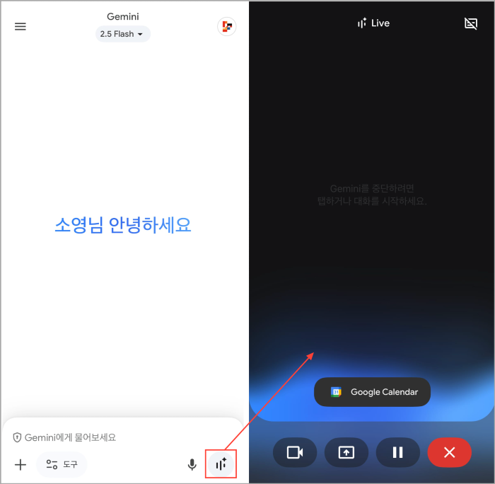 - Gemini ๋ชจ๋ฐ์ผ ์ฑ์์ ์์ฑ๋ํ๋ก ์ง์ํ๋ ๊ฒ๋ ๊ฐ๋ฅํฉ๋๋ค. ์๋ ์ด๋ฏธ์ง์ ํ์๋๋๋ก ํ๋กฌํํธ ์ ๋ ฅ์ฐฝ ๊ฐ์ฅ ์ค๋ฅธ์ชฝ ๋ฒํผ์ ํด๋ฆญํ๋ฉด Gemini Live๊ฐ ์คํ๋๋ฉฐ ์์ฑ๋ํ๋ฅผ ์ฃผ๊ณ ๋ฐ์ ์ ์์ต๋๋ค. ์ด ๋ 'OO ์ผ์ ๋ฑ๋กํด์ค'๋ผ๊ณ ๋งํ๋ฉด ์ผ์ ์ด ์ถ๊ฐ๋ฉ๋๋ค.