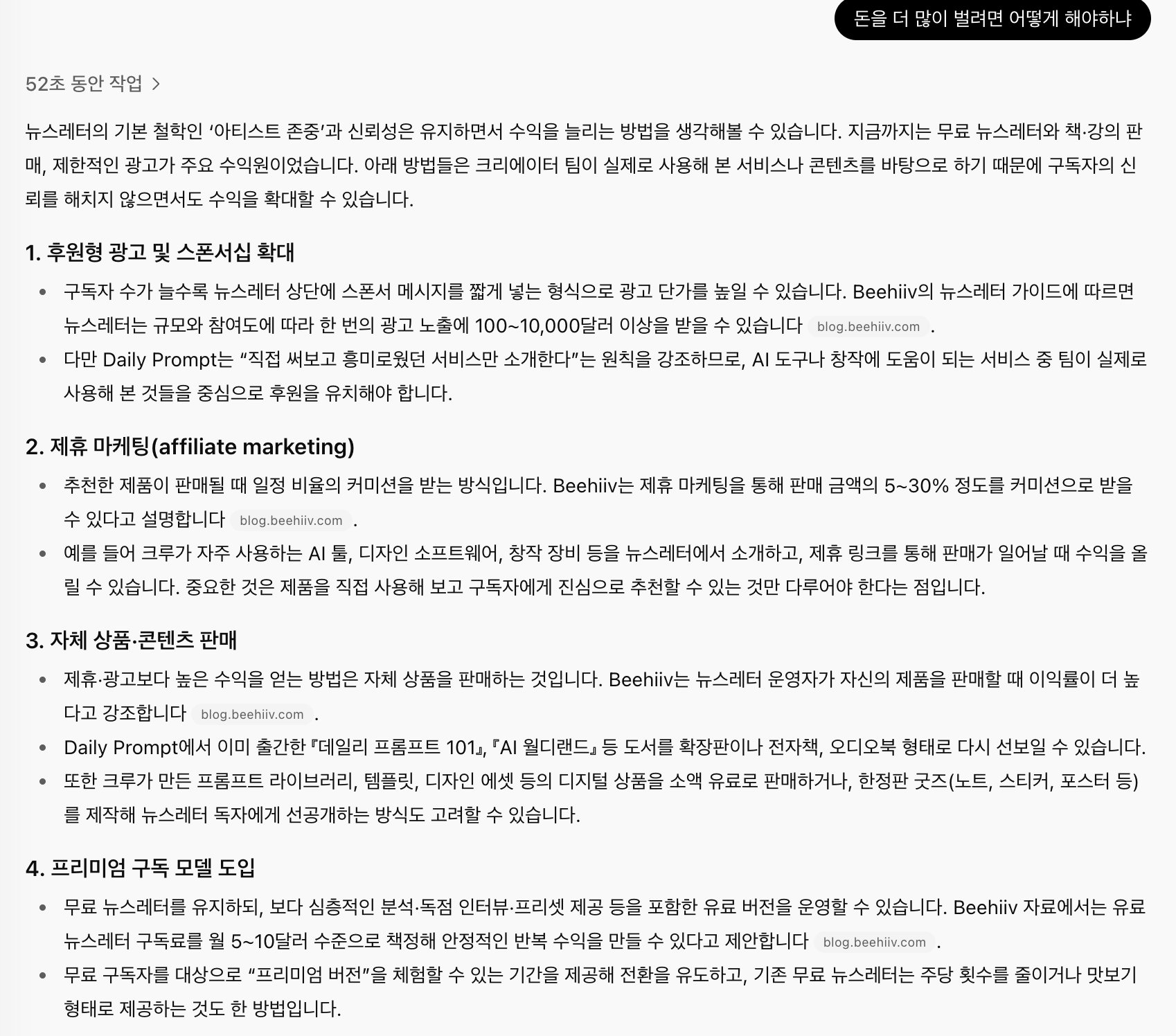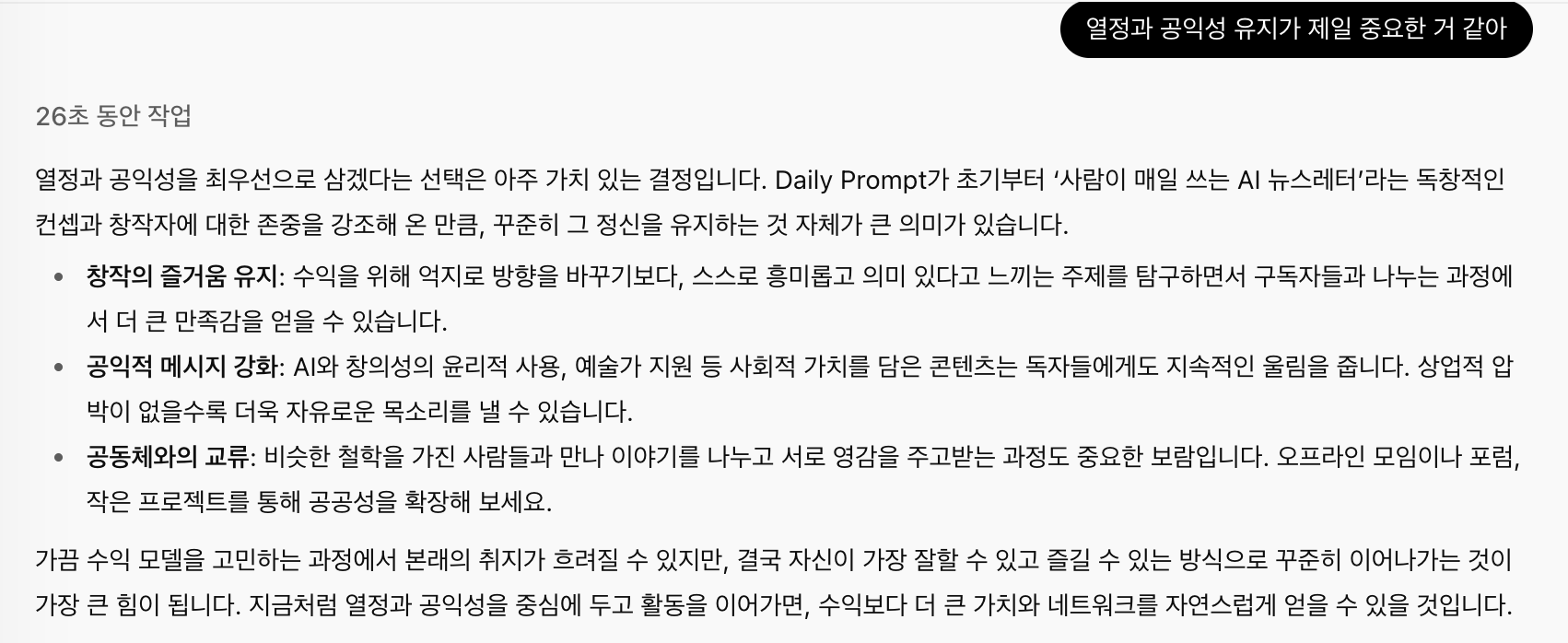- '๋ฐ์ผ๋ฆฌ ํ๋กฌํํธ'๋ฅผ ๋ฌด๋ฃ๋ก ๋ฐํํ๊ณ ์๋ค๊ณ ์๊ฐํ๋ฉด, '๊ทธ๋ผ ๋ญ๋ก ์์ตํ๋ฅผ ํ์ธ์?'๋ผ๊ณ ๋ฌผ์ด๋ณด๋ ๋ถ๋ค์ด ๊ณ์ญ๋๋ค. ์ต๊ทผ์ ๋ถ์ฉ ๊ทธ๋ฐ ์ง๋ฌธ์ ๋ง์ด ๋ฐ๊ธฐ๋ ํ์ต๋๋ค. ํฌ๋ฃจ๋ค๊ณผ๋ ์ด ์ฃผ์ ๋ก ์ด์ผ๊ธฐ๋ฅผ ๋๋ ๋ดค์ง๋ง '๋ฐ์ผ๋ฆฌ ํ๋กฌํํธ'์ ๊ฐ์น๋ '๋๋'์ ์๋ ๊ฒ ๊ฐ๋ค๋ ๊ฒฐ๋ก ์ ๋ด๋ ธ์ต๋๋ค. 2023๋ ์ '๋ฐ์ผ๋ฆฌ ํ๋กฌํํธ'๋ฅผ ์์ํ ์ด์ ๋, ์ข์ ํ๋กฌํํธ๋ฅผ ๊ณต์ ํ๋ค๋ณด๋ฉด ์ฌ๋๋ค์ด ๊ตณ์ด ํ๋กฌํํธ ๋ง์ผ์์ ์ฌ๊ณ ํ์ง ์์๋ AI๋ฅผ ์ ์ฌ์ฉํ ์ ์๊ฒ ๋๊ธธ ๋ฐ๋ผ๋ ๋ง์์ด์์ต๋๋ค.