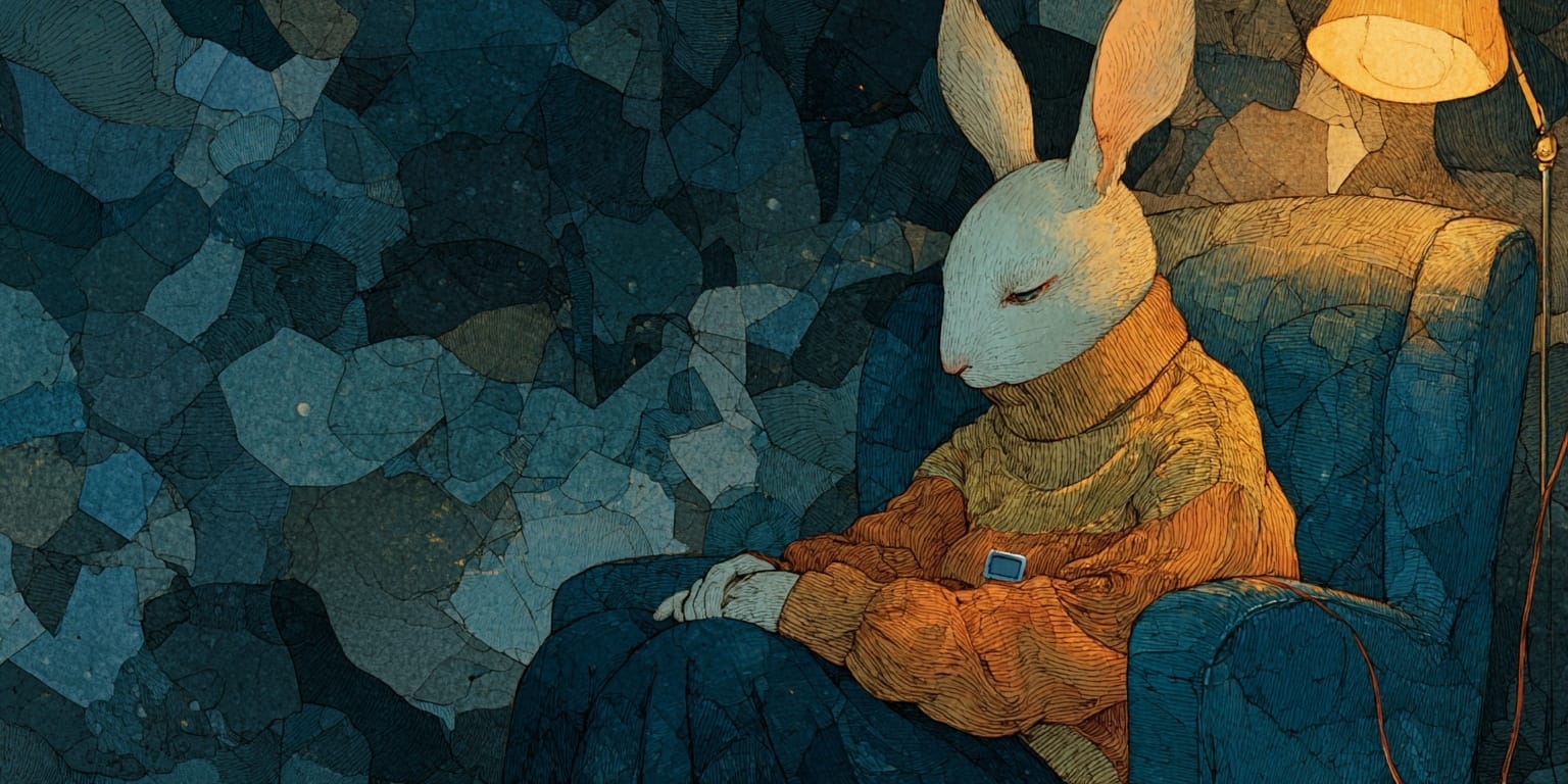 Storybook illustration of a petite rabbit-girl with low energy, curled on a vintage armchair, muted winter blues and warm amber lamp glow, watercolor texture, gentle brush strokes, overhead composition, oversized sweater, tiny patch like a battery icon, cozy nostalgic mood, high detail --ar 2:1 --raw --stylize 1000