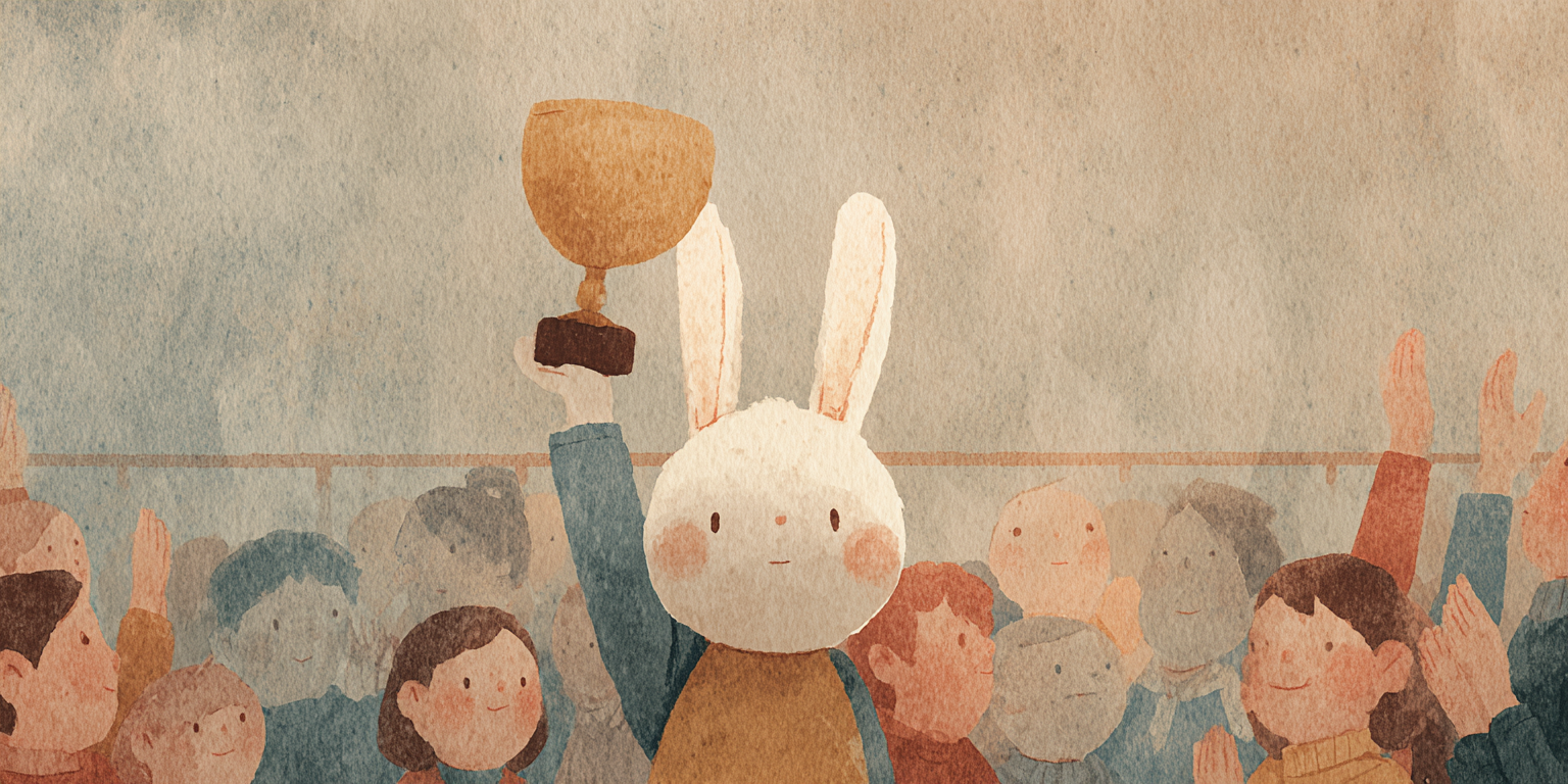 Storybook illustration of a small rabbit-girl holding a shiny trophy aloft, cozy school gym, friends clapping, soft watercolor texture, warm pastel palette, overhead composition, whimsical and heartwarming mood --chaos 10 --ar 2:1 --raw --stylize 1000