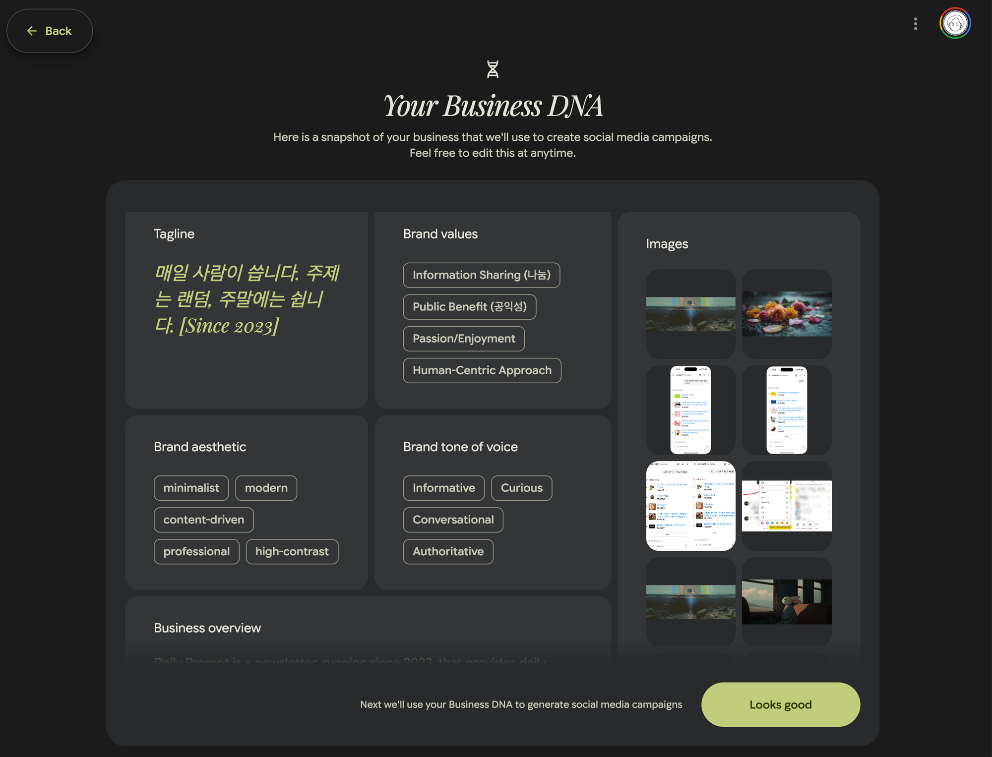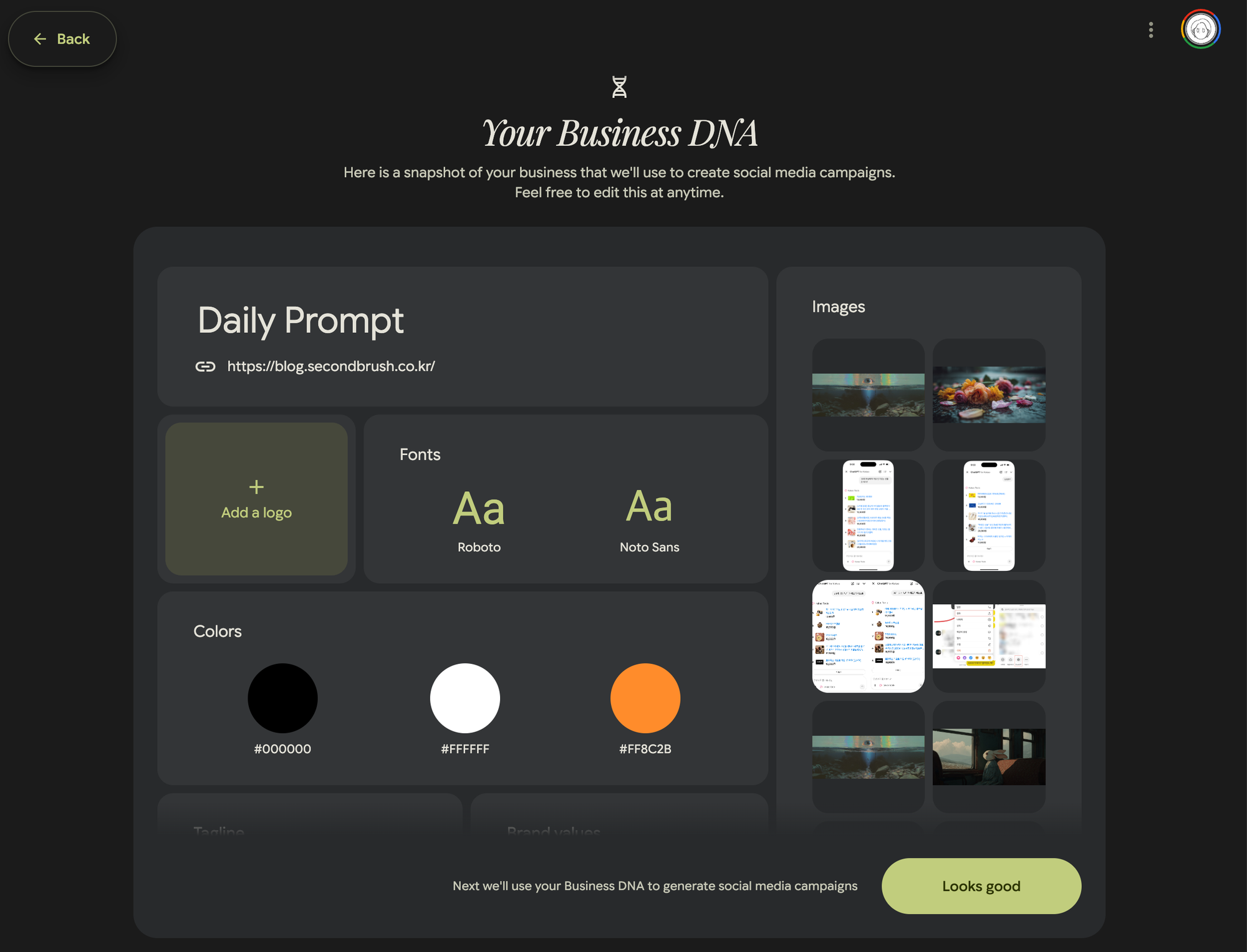 'λ°μΌλ¦¬ ν둬ννΈ'μ νκ·ΈλΌμΈ(tagline), λΈλλ κ°μΉ(brand values), λΈλλμ λμμΈ ν€μλ(brand aesthetic), μ¬μ§μ΄ λΈλλ λ§ν¬(tone of voice)λ ν€μλλ‘ μ 리ν΄μ€λλ€. νλ¨ 'Looks good' λ²νΌμ ν΄λ¦νλ©΄ λ§μΌμΈ μΊ νμΈ μμ±μ ν΄μ€λλ€.