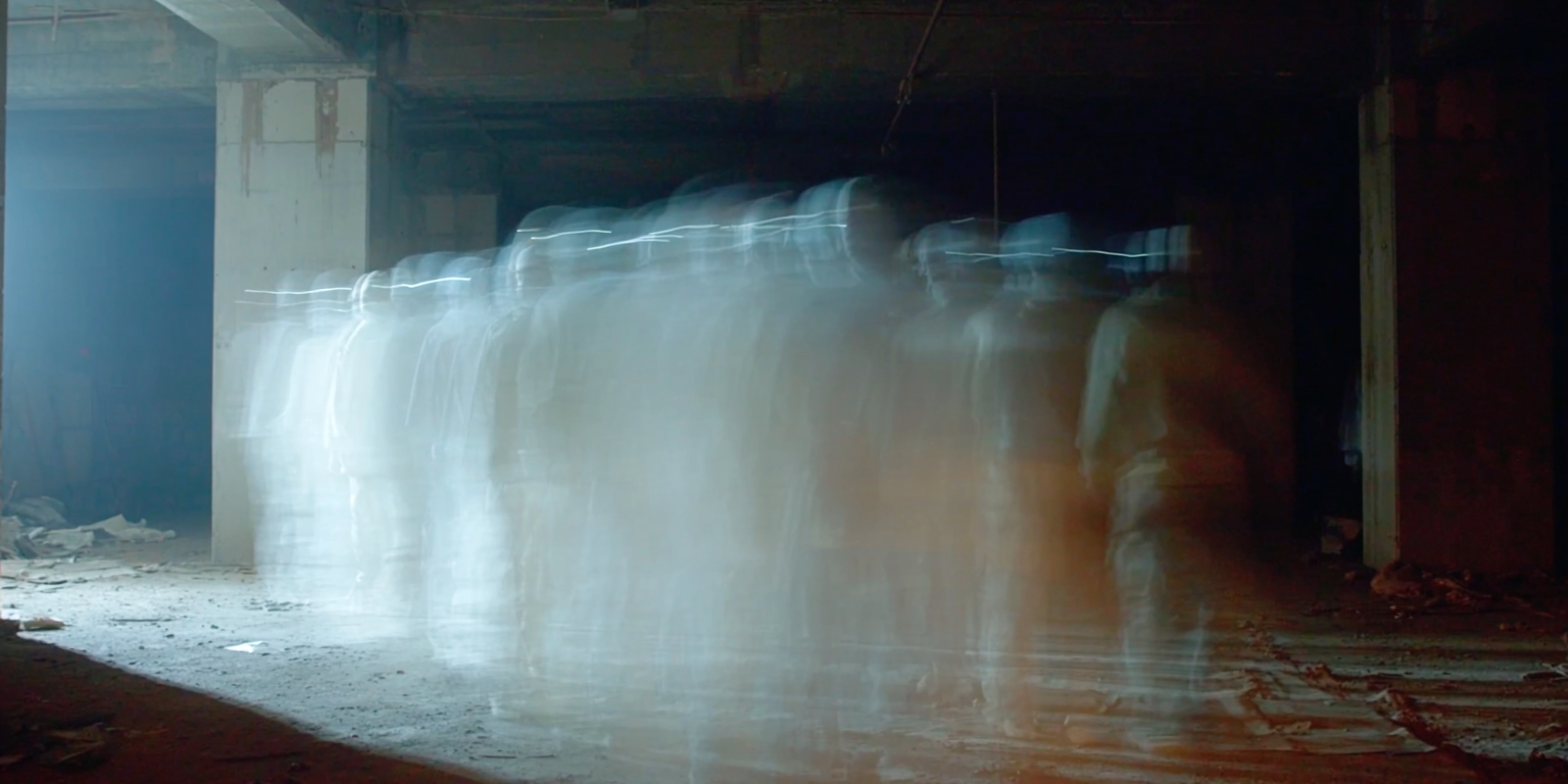 Time-lapse of construction workers rapidly building a space, leaving ghostly afterimages of their movements. A dark, gritty post-punk atmosphere with modern darkwave influences. The scene should show a construction site with people moving in fast motion, their silhouettes fading in and out, capturing the passage of time. The background features an urban, industrial environment under dim lighting, emphasizing shadows and unfinished walls. The space regenerates itself as workers build and dismantle, evoking a sense of space regeneration --chaos 5 --ar 2:1 --raw --stylize 150