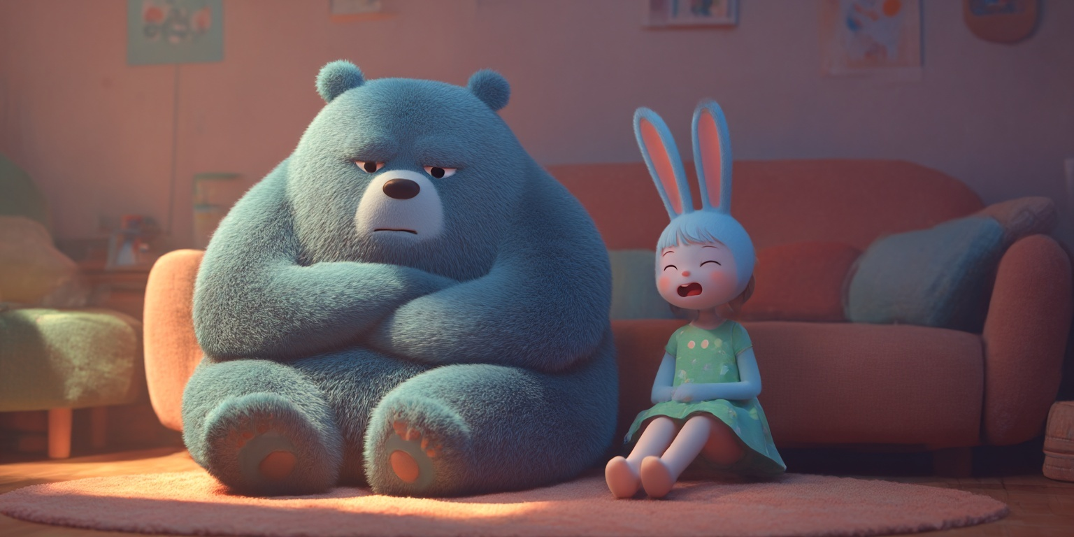 Cinematic illustration of a sulky bear character sitting with crossed arms, beside a playful bunny girl showing aegyo, in a cozy pastel-colored room, soft warm lighting, humorous yet heartwarming atmosphere, detailed expressions, Pixar-style 3D character rendering, shallow depth of field, high detail --chaos 5 --ar 2:1 --stylize 150