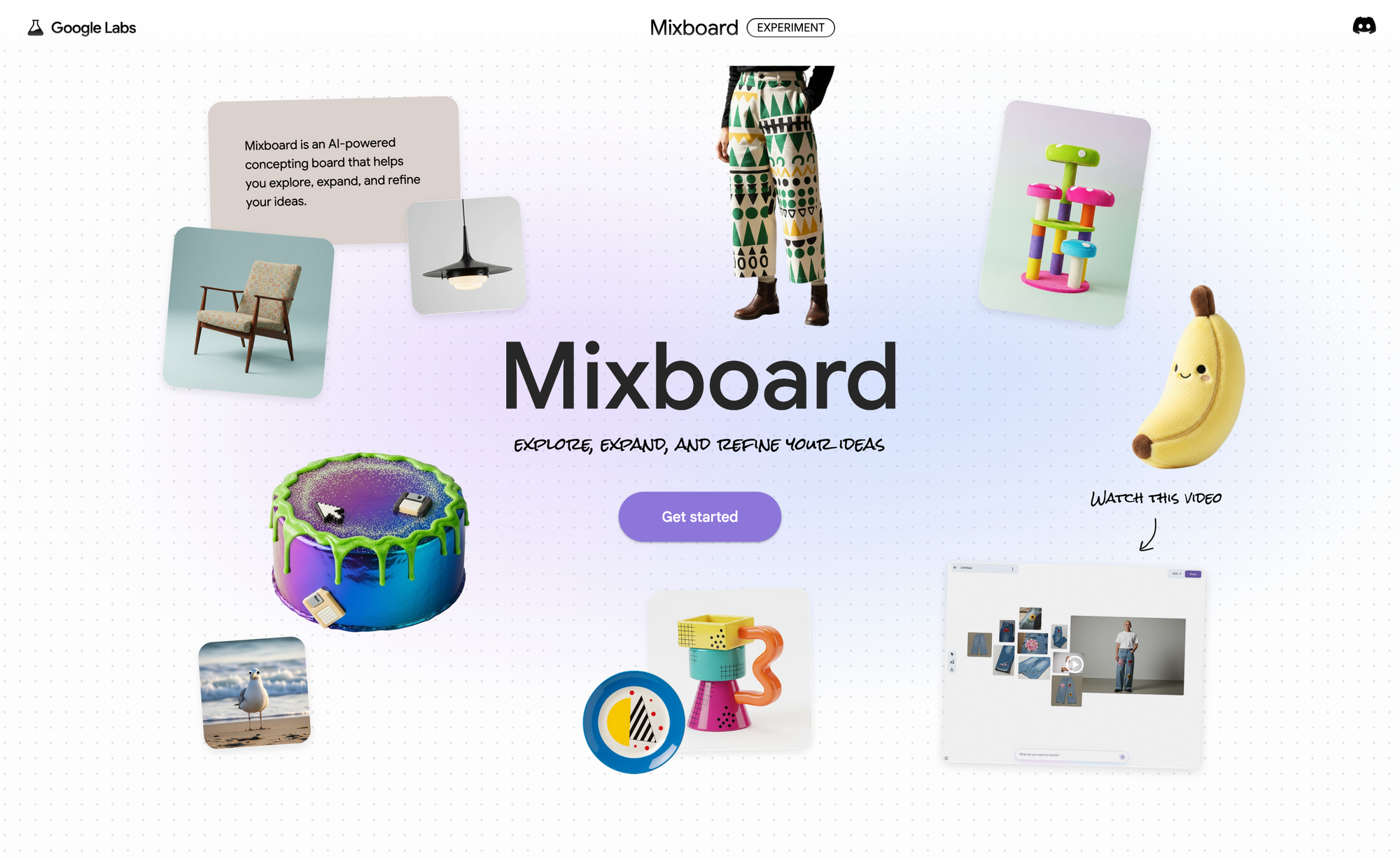 ๋จผ์ โ์๋์ ๊ฐ์ด Google Mixboard์ ์ ์ํ ๋ค 'Get started' ๋ฒํผ์ ํด๋ฆญํฉ๋๋ค.