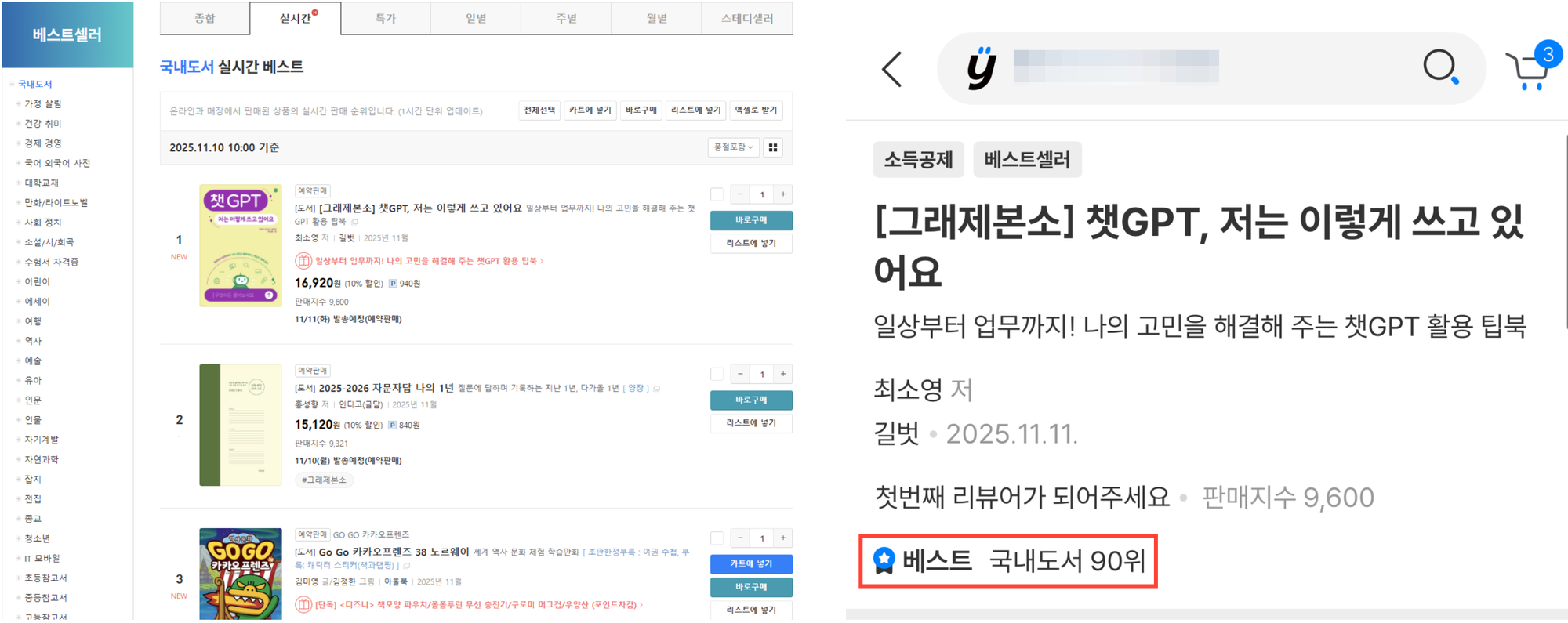 - μ€λ μ€μ μΆνμ¬ μλν°λμΌλ‘λΆν° μ κ° <μ±GPT, μ λ μ΄λ κ² μ°κ³ μμ΄μ>κ° Yes24 μ€μκ° λ² μ€νΈ 1μλ₯Ό κΈ°λ‘νλ€λ μμμ μ λ¬λ°μμ΅λλ€πππ λλΆμ΄ κ΅λ΄λμ μ’