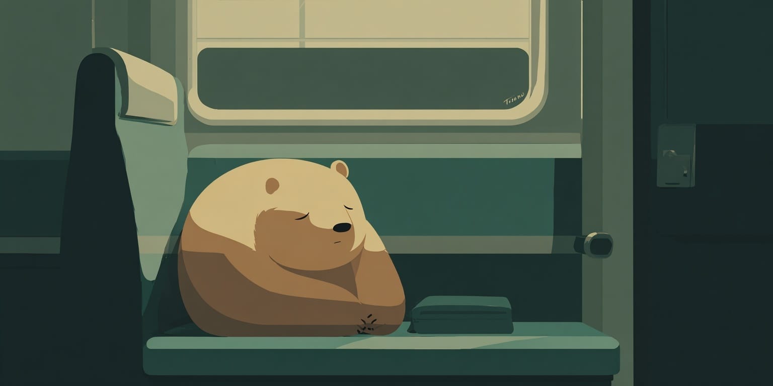 Graphic poster composition, centered of a cute bear character curled up on a train seat with a small travel blanket simple carriage interior, window rectangle as backdrop limited palette: cream, forest green, midnight blue; cozy mood soft diffuse lighting, gentle shadow under seat bold shapes, thick outlines, minimal details, flat color planes vector style, smooth curves, high contrast edges --chaos 5 --ar 2:1 --raw