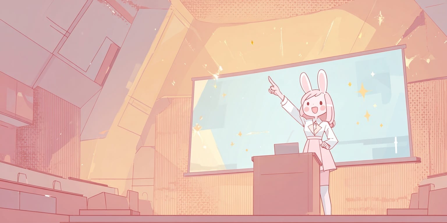 Anime illustration, cute rabbit girl giving an awesome presentation, modern auditorium with large screen and podium, warm pastel palette with energetic accents, bright key light and soft rim light, dynamic pose pointing at glowing slide, confident smile, floating sparkles and motion lines, cel shading, clean line art, subtle halftone texture, slight depth of field --chaos 5 --ar 2:1 --raw --stylize 120