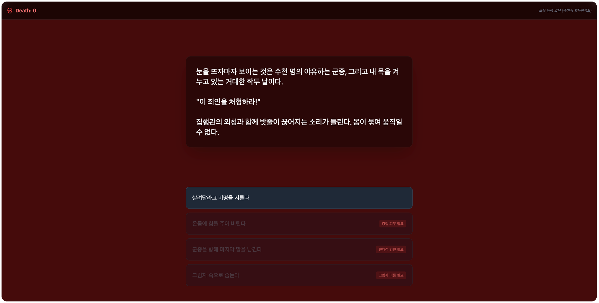 ์ฃผ์ธ๊ณต์ด ์ฃฝ์ ๋ค ๋ค์ ์ด์๋์ ์ถ์ ์ฐ๋ค๋ 'ํ๊ท๋ฌผ' ์์ค์ด ๊ฒ์์ผ๋ก ๊ตฌํ๋์์ต๋๋ค. ํ ์คํธ ๊ธฐ๋ฐ์ผ๋ก ์ด์ผ๊ธฐ๊ฐ ์งํ๋๋ฉฐ ์ฌ๋ฌ๋ฒ ์ฃฝ์ผ๋ฉด์ ์์ดํ ์ ํ๋ํ ์ ์์ต๋๋ค.